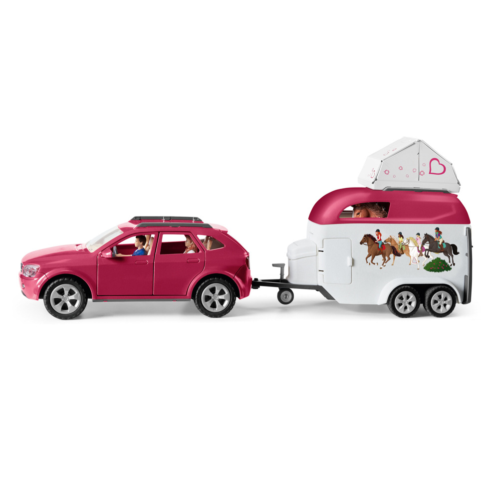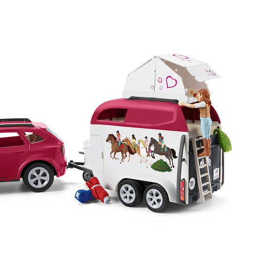 Sada obsahuje: 1x SUV, 1x přívěs na koně, 1x stan, 1x dívka, 1x muž, 1x klisna, 1x sedlo, 1x uzda s otěží, 2x balíky slámy, 1x síť na seno, 1x žebřík, 1x klobouk, 1x helma, 1x kbelík, 1x box na péči, 1x masážní kartáč, 1x hřeblo. Figurky Schleich jsou mimořádně detailní, láskyplně malované a umožňují dětem hrát si a zároveň se učit.