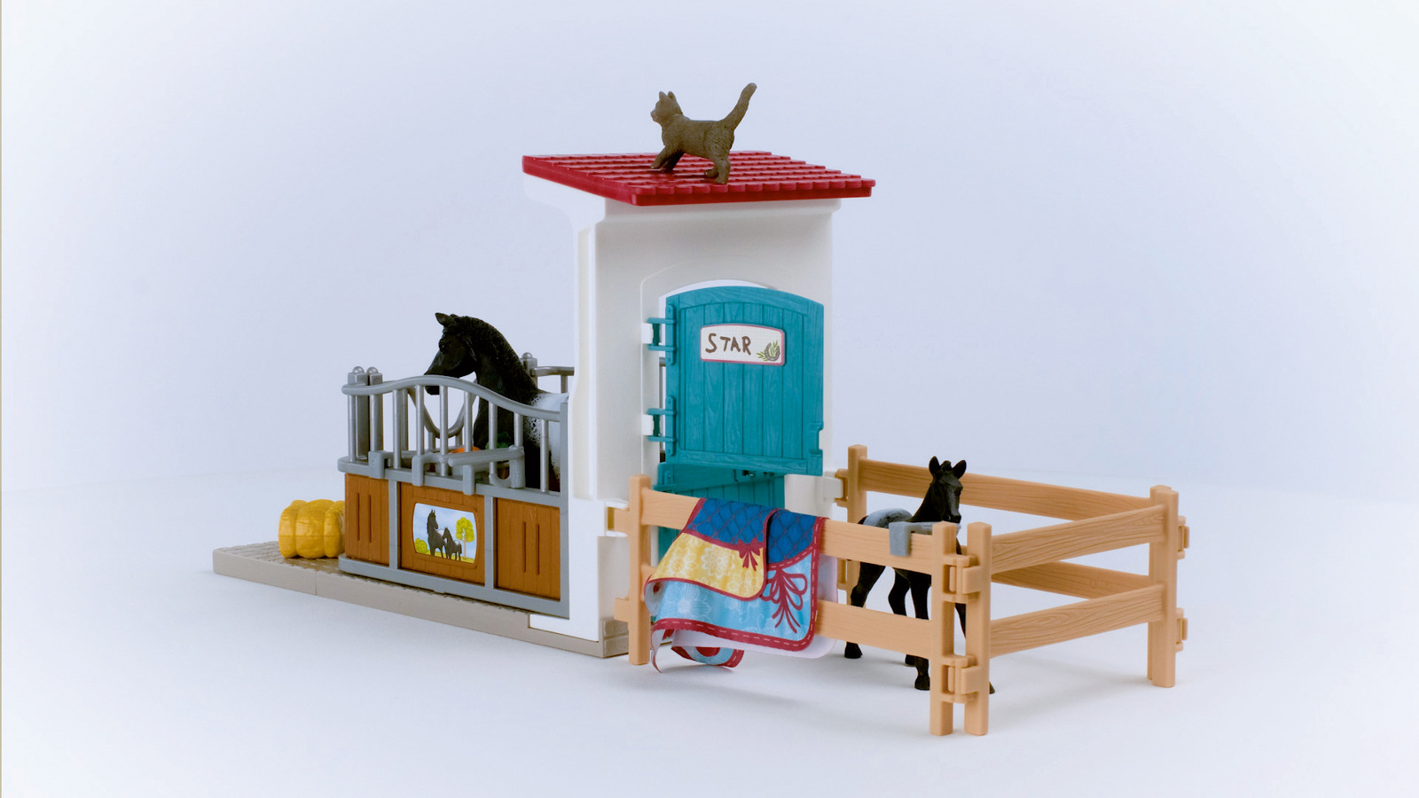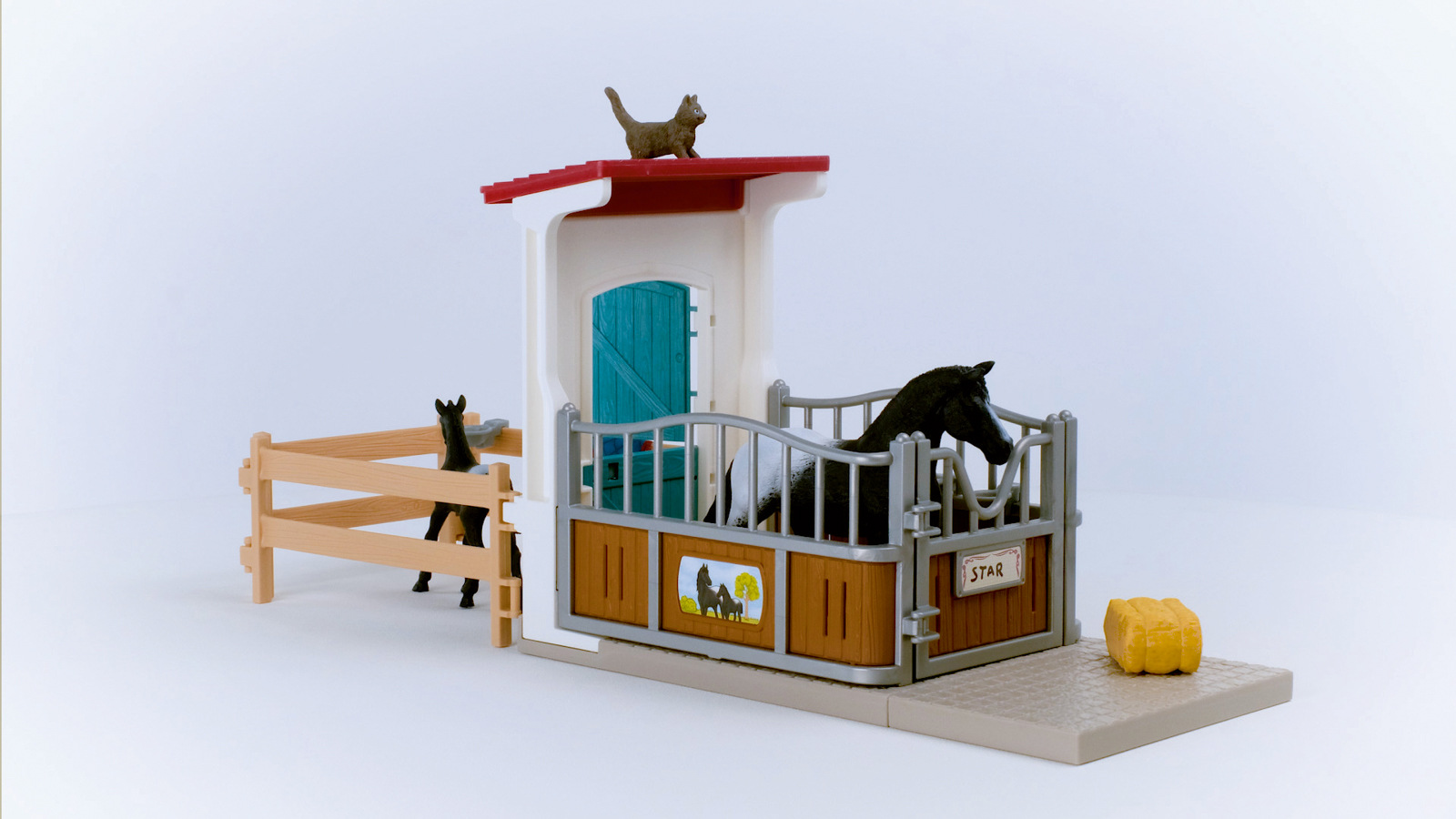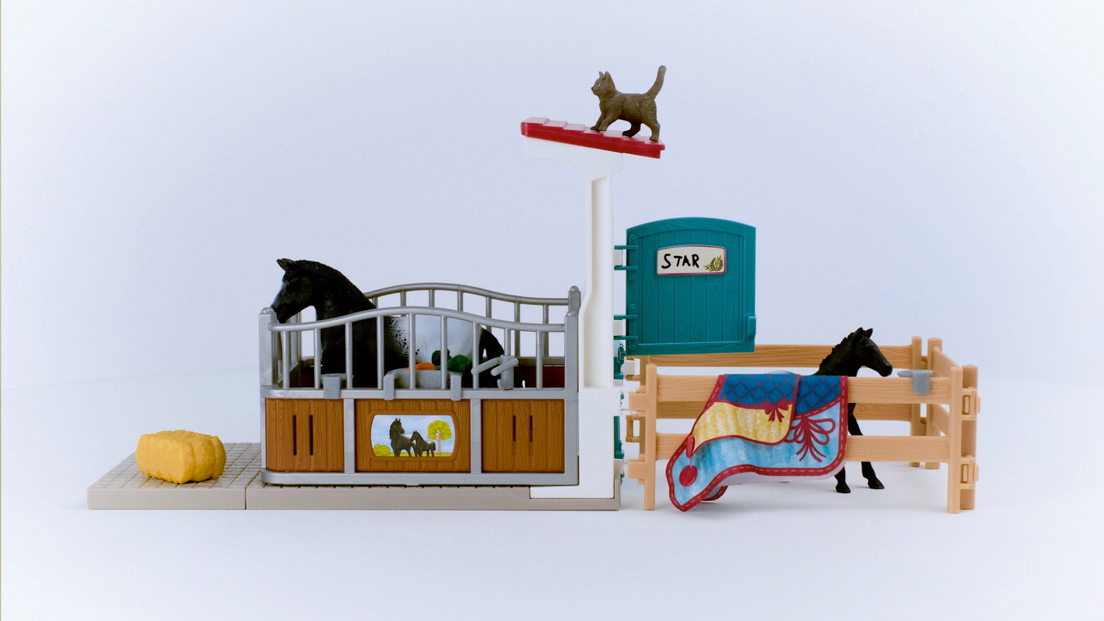 Není divu, že se klisna plemene Appaloosa a její hříbě cítí v boxu tak dobře. Je tu tak útulno a mají tady všechno, po čem jejich srdce touží. Krmení je v držáku na seno a měkké deky pro koně jsou připravené, takže je jen stačí dát pod sedlo. Zatímco klisna a hříbě pijí vodu z napáječky, kočka jim dělá společnost. Uvelebila se na balíku slámy. O mrkev, kterou může okusovat jen kůň, ale zájem nejeví. Možná se oba vydají do ohrady, aby se společně pobavili. Rozměry: 24,5x19x8,2cm. Vhodné pro děti od 3 let.