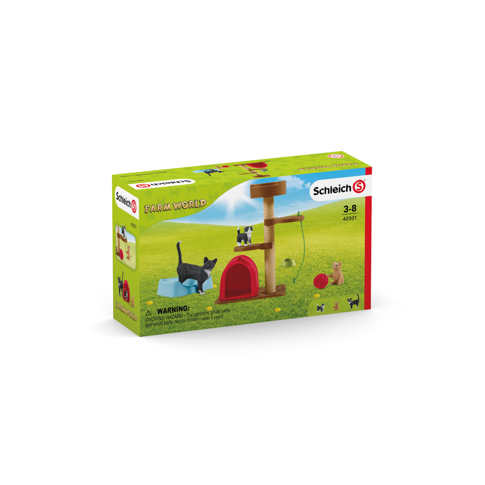 Ve hře „Hra roztomilých kočiček“ ze světa Schleich® Farm World si roztomilé kočky hrají s klubíčkem vlny, poskakují kolem svého škrabacího stromu, nebo se schovávají ve svém malém domečku. Potom si vždy odpočinou ve svém pelíšku. Škrabací strom lze nastavit dle aktuální potřeby kočiček. Schleich® figurky jsou všechny modelovány v nejjemnějším detailu, láskyplně malované a povzbuzují děti k tomu, aby hrály a zároveň se učily.