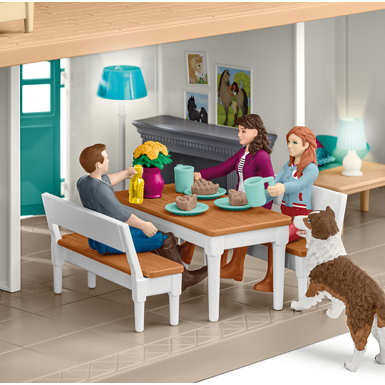 Venkovský dům a stáj u jezera HORSE CLUB rodiny Kramerových je skutečným rájem pro milovníky koní. Každé ráno arabská klisna a její hříbě netrpělivě čekají, až je Hannah osedlá a vyjede s nimi na projížďku. Border kolie Ruby se také ráda přidá. Po vyjížďce je Hannah ve stáji důkladně umyje a vykartáčuje. Ve vzduchu se vznáší vůně jablečného koláče. Paní Kramerová musí péct. Na balkoně společně kousek ochutnají. Hannah nechodí večer hned spát. Raději si vyleze na půdu. Tam sleduje dalekohledem hvězdnou oblohu. Dokáže zahlédnout svou budoucnost vepsanou ve hvězdách? Venkovský dům a stáj u jezera HORSE CLUB má všechno, co koně a jejich přátelé můžou potřebovat. Uzda a sedlo pro jízdu jsou uložené ve stáji. Potom na tebe čeká hadice na vodu, kbelík a kartáč na péči o hříbě a arabskou klisnu. Dům rodiny Kramerových je pohodlně zařízený a má dokonce balkon. Dokonce i rodinný pes Ruby se tu cítí jako doma. Figurky jsou plně pohyblivé. Tento výrobek Schleich® patří do tematického světa HORSE CLUB a je vhodný pro děti ve věku od 5 do 12 let.