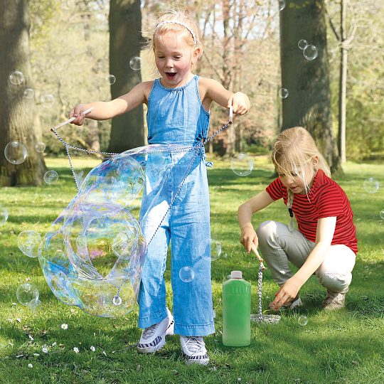 Sada pro vytváření velkých bublin. Smyčka je ideální na vytváření velkých bublin a úžasných efektů jen za pomoci větru. Univerzální obruč, je vhodná i pro děti. Již při malém množství tekutiny dokážete vytvořit úžasné bubliny. Sada obsahuje náplň 0,45 litrů. Rozměr balení: 15 x 42 x 12 cm Vhodné od 3 let