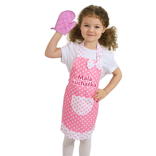 Roztomilá dětská kuchařská zástěra v růžovém provedení s bílými puntíky. Tuto vychytávku ocení každá malá hospodyňka při pomoci v kuchyni. Obsahuje také rukavici.