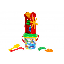 Parádní sada na písek s mlýnkem. Obsahuje kyblík 16 cm, mlýnek, lopatku, hrábě, sítko a 2 ks formiček. Barvy se mohou lišit od vyobrazení.