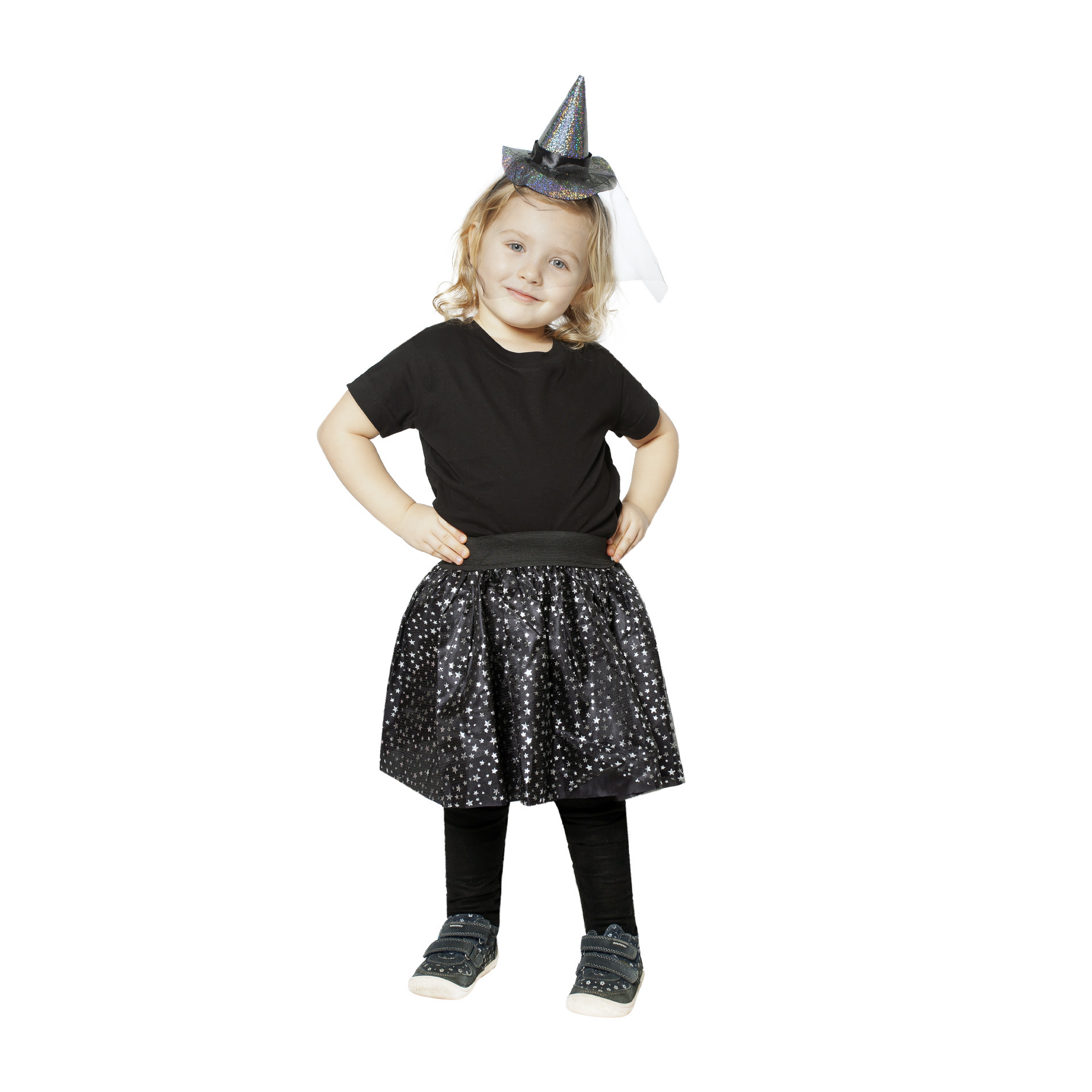 Bezva sada pro všechny malé parádnice čarodějnice! Sukýnka má černou spodničku, překrytou tylem s potiskem stříbrných hvězdiček. Je určena pro holčičky ve věkovém rozmezí 3-7 let. Délka sukně je 28 cm. Set je doplněn o čelenku s kloboučkem, který perfektně ladí k sukýnce. Skvěle se hodí i na oslavu Halloweenu nebo karneval!