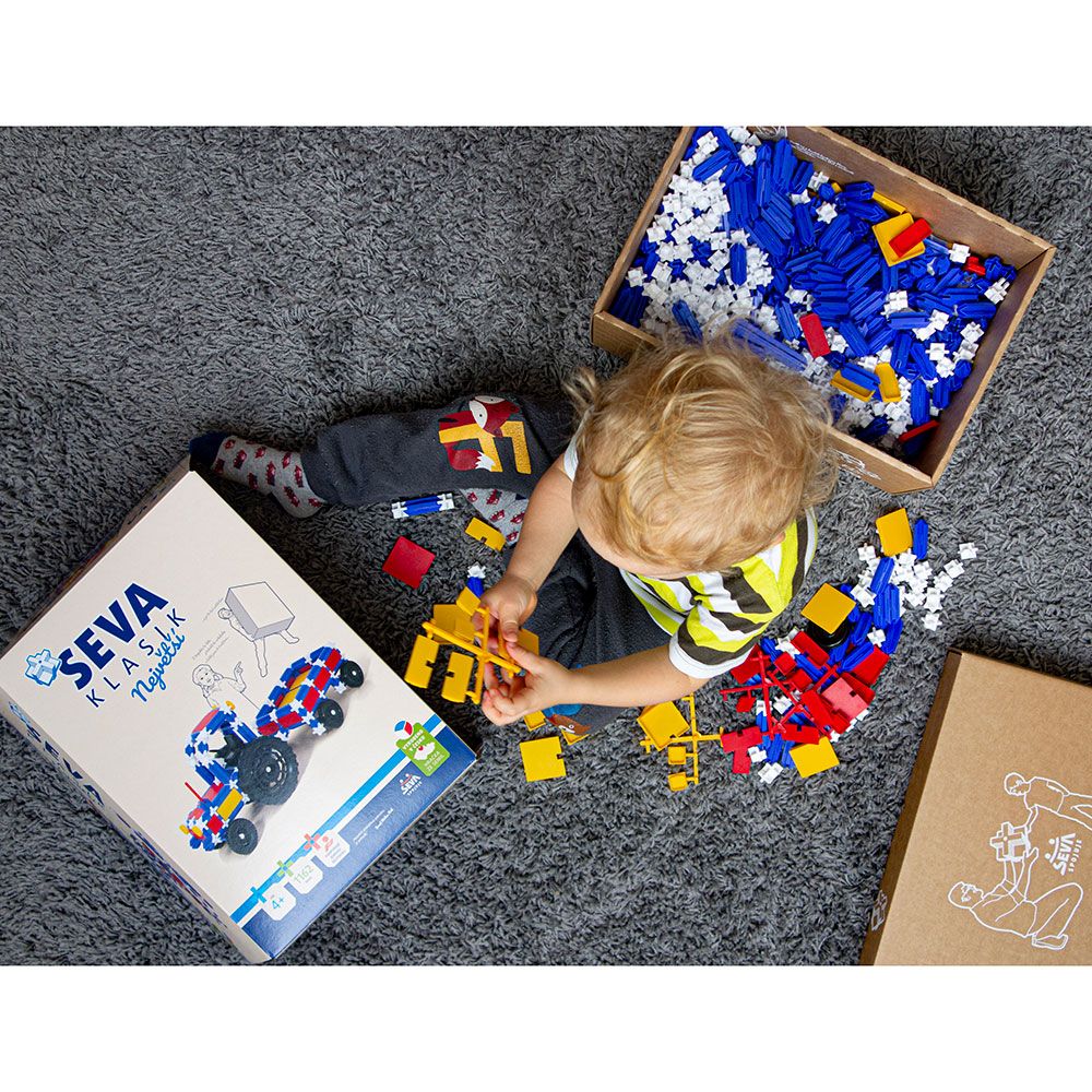 Postavte si traktor, vrtulník, nebo cokoli jiného – stavebnice obsahuje 1162 dílků a fantazii se meze nekladou. Všechny námi vyráběné hračky jsou pravidelně testovány renomovanou zkušebnou a splňují veškeré požadavky bezpočnosti a nezávadnosti podle normy EN71. Její věková hranice není nijak omezená. I když jako výrobce doporučujeme stavebnici pro děti od 4 let, máme zjištěno, že za dozoru rodičů se s ní vyhrají i 3 leté děti. Tato ČESKÁ stavebnice SEVA neobsahuje nebezpečné ftaláty, není tedy důvod, proč by měla chybět v některém dětském pokojíčku. Všechny stavebnice SEVA jsou navíc navzájem kompatibilní, proto je můžete neustále rozšiřovat. Jelikož pečujeme o zdravý rozvoj dětí, není nám lhostejný ani stav životního prostředí, ve kterém budou vyrůstat. Proto přinášíme naše hračky z kvalitního recyklovatelného plastu v nových obalech, které zatěžují přírodu co nejméně.