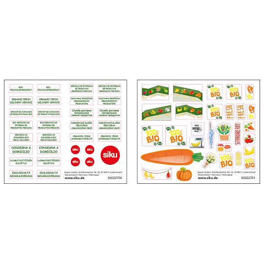 Čerstvá vejce a mléko, křupavý rustikální chléb, šťavnaté ovoce a křupavá zelenina přímo z polí – BIO donášková služba doveze jídlo přímo k vašim domovním dveřím ve městě. Ekologické je nejen zboží, ale i doprava, protože elektrická dodávka StreetScooterem je zcela bez emisí. Kabina řidiče tohoto modelu siku je vyrobena z kovu a nástavba je plastová. Pro nakládání a vykládání lze otevřít víko v zadní části. S přiloženým archem samolepek může být přepravník navíc ozdoben nápisem „Čerstvé bio dodávky“ v různých jazycích a také barevnými obrázky ovoce a zeleniny. A protože zásilková služba vyžaduje vhodné produkty, jsou k dispozici také čtyři kartonové archy, ze kterých lze vylisovat předtištěné potraviny, jako je ovoce, zelenina, vejce a mléko. Pouze na dvou ze čtyř listů jsou však komponenty vytištěny plnobarevně. Na zbylé dva listy jsou vytištěny pouze obrysy, a tak jsou děti samy kreativní a mohou si potraviny barvit, jak chtějí. Rozměry balení: 17,5 x 9,7 x 7,1 cm. Věk: 3+ ... více