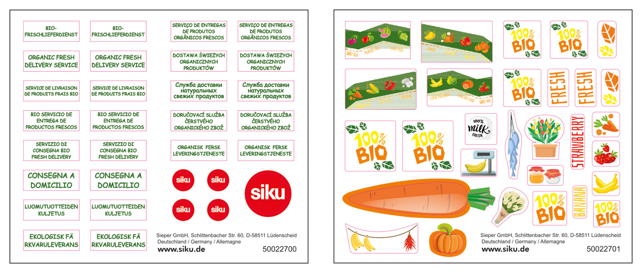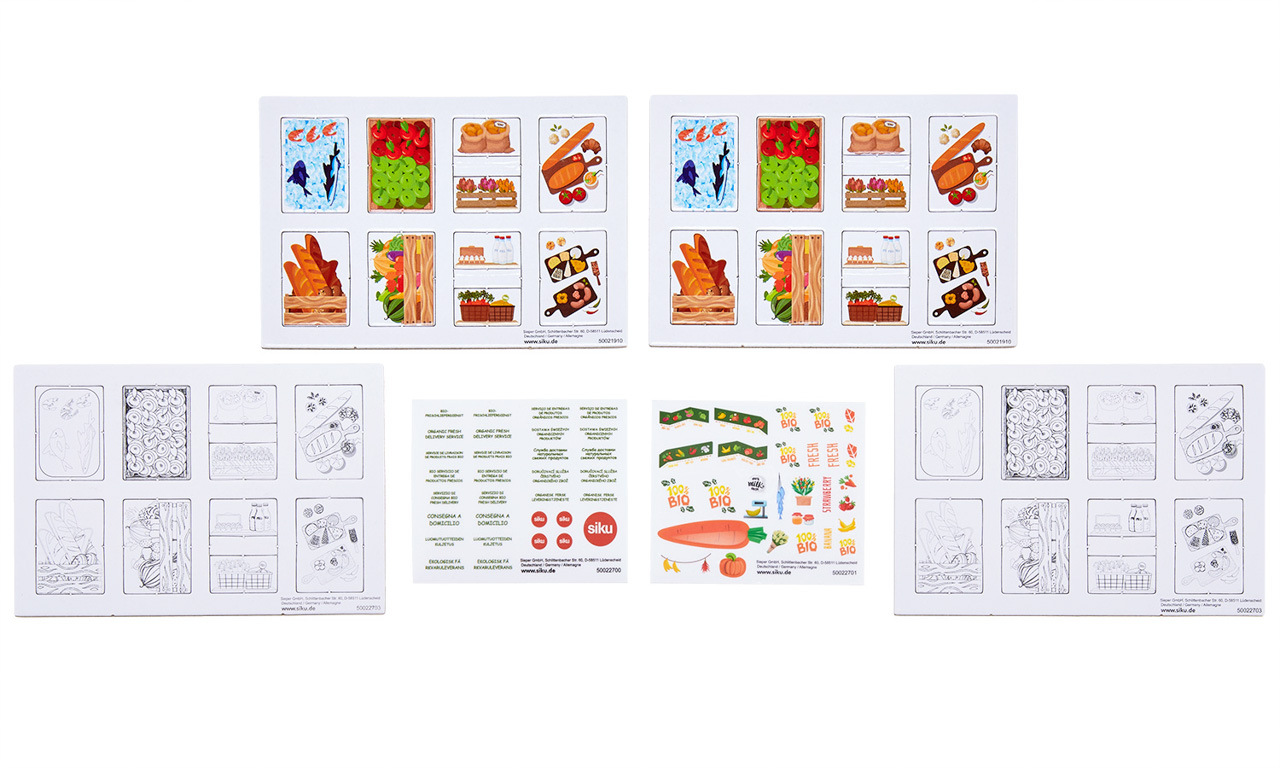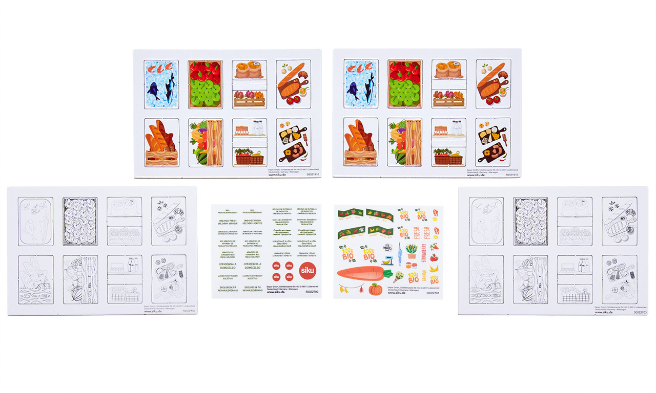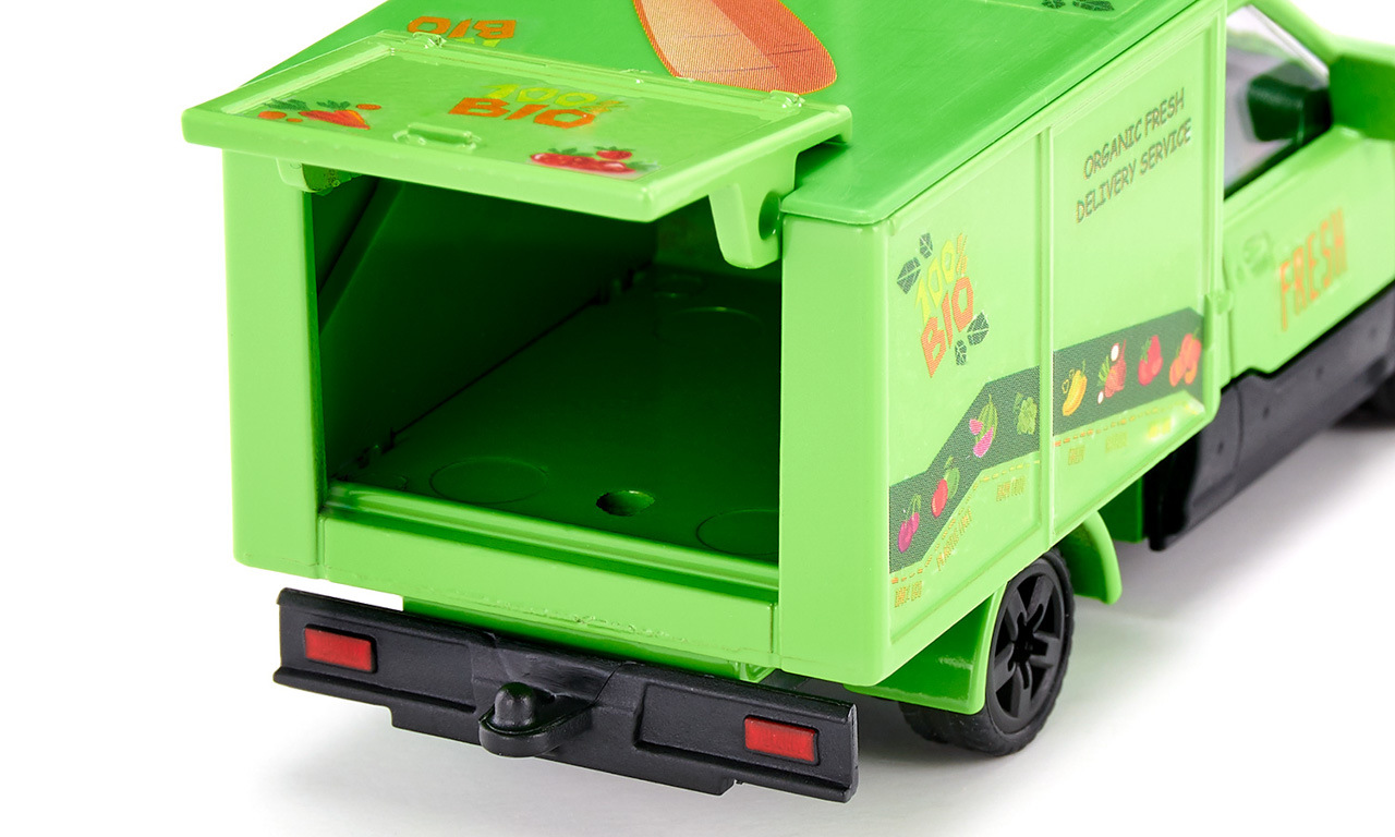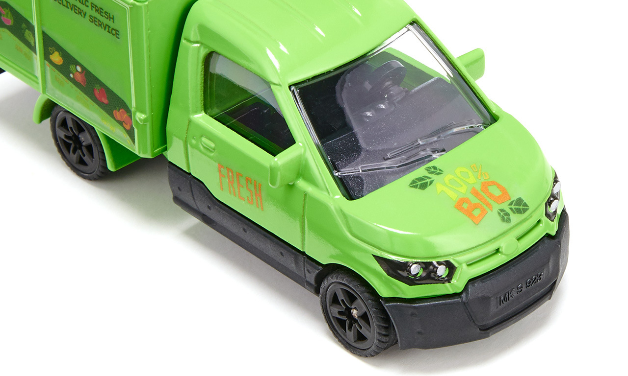 Čerstvá vejce a mléko, křupavý rustikální chléb, šťavnaté ovoce a křupavá zelenina přímo z polí – BIO donášková služba doveze jídlo přímo k vašim domovním dveřím ve městě. Ekologické je nejen zboží, ale i doprava, protože elektrická dodávka StreetScooterem je zcela bez emisí. Kabina řidiče tohoto modelu siku je vyrobena z kovu a nástavba je plastová. Pro nakládání a vykládání lze otevřít víko v zadní části. S přiloženým archem samolepek může být přepravník navíc ozdoben nápisem „Čerstvé bio dodávky“ v různých jazycích a také barevnými obrázky ovoce a zeleniny. A protože zásilková služba vyžaduje vhodné produkty, jsou k dispozici také čtyři kartonové archy, ze kterých lze vylisovat předtištěné potraviny, jako je ovoce, zelenina, vejce a mléko. Pouze na dvou ze čtyř listů jsou však komponenty vytištěny plnobarevně. Na zbylé dva listy jsou vytištěny pouze obrysy, a tak jsou děti samy kreativní a mohou si potraviny barvit, jak chtějí. Rozměry balení: 17,5 x 9,7 x 7,1 cm. Věk: 3+ ... více