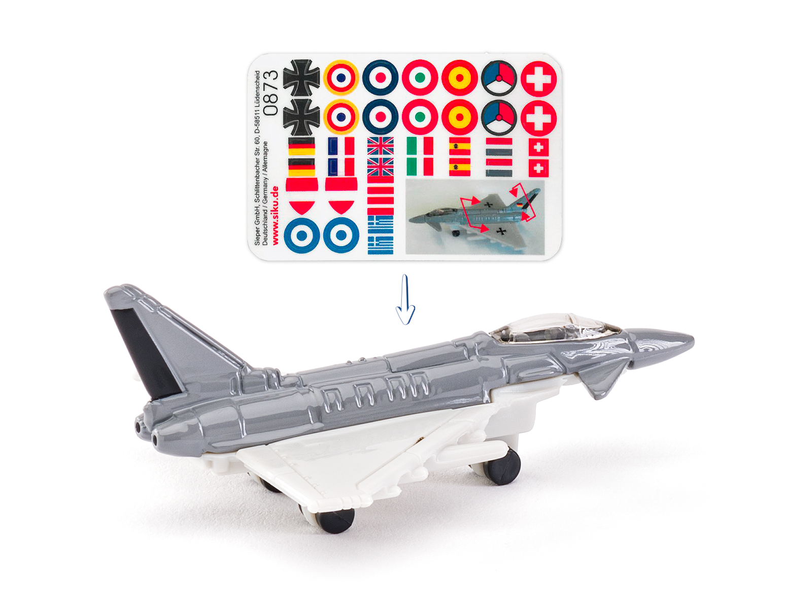 Věrná originální replika vojenské stíhačky. Tento model SIKU se vyznačuje realistickými detaily a je vyroben z tlakově litých kovových a plastových komponentů. Modely SIKU neobsahují žádné PVC a splňují mezinárodní bezpečnostní normy pro hračky. Model stíhačky je doplněn sadou samolepek, které umožnují vytvořit si osobitý design. Rozměry modelu: 2,7 x 4 x 7 cm. Rozměry balení: 7,8 x 9,7 x 4,1 cm. Baleno v blistru. Věk: 3+... více