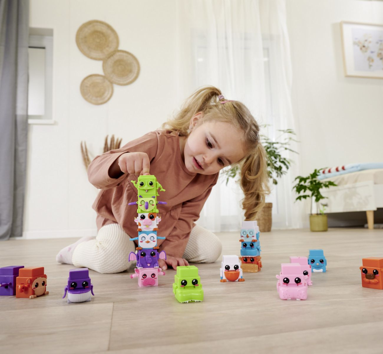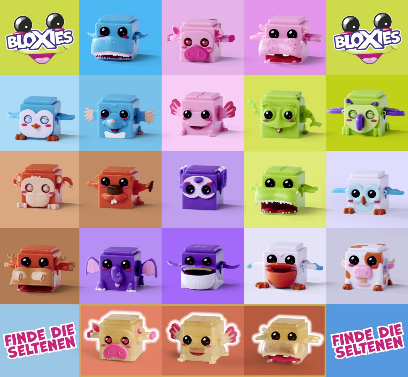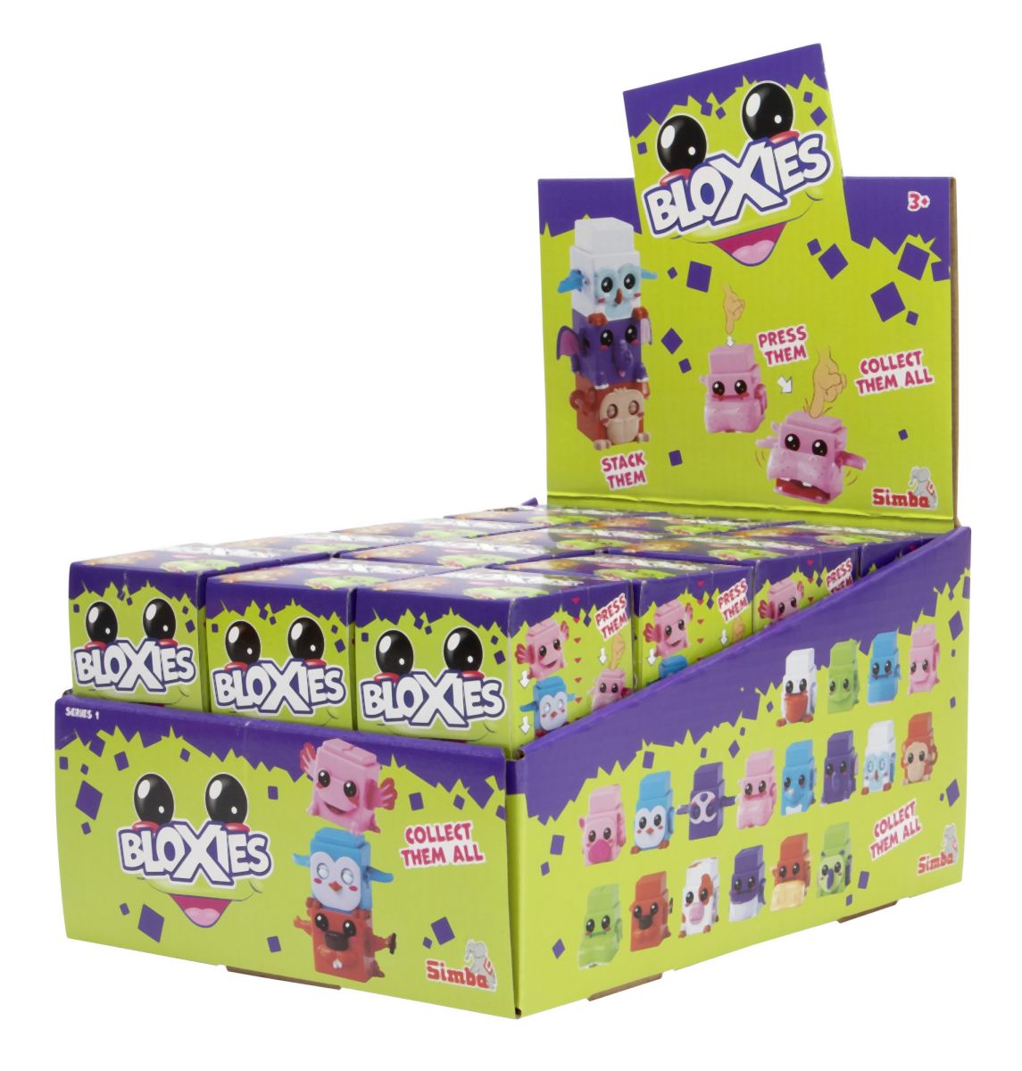 Skládejte, žasněte, sbírejte, hrajte!! Bloxies - barevná a známá zvířátka ve čtvercovém provedení - překvapují svými vtipnými pohyby. Pokud je naskládáte do věže, stačí stisknout horní kostku a všechny se budou pohybovat současně. Nekonečná zábava! Displej obsahuje 18 druhů základních zvířátek a 3 vzácné. Výška figurek 4,5 cm. Vhodné pro děti od 3 let. Displej obsahuje 24 ks.