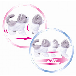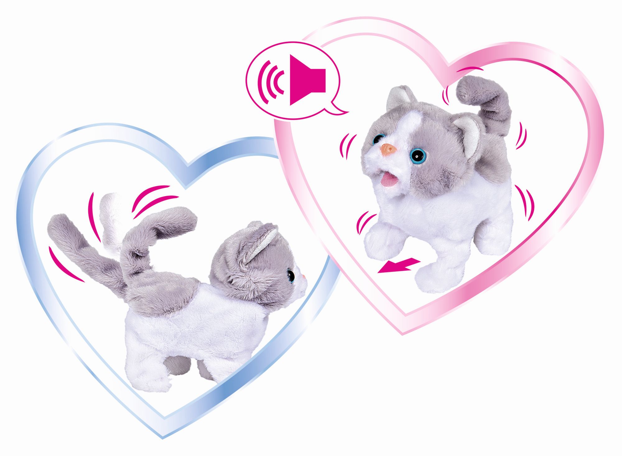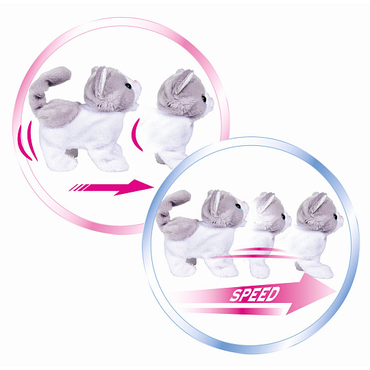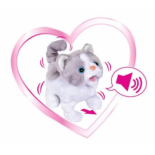 Šedobílá kočička z měkkého plyše se může pohybovat dvěma různými rychlostmi a vrtět ocáskem. Vydává skvělé zvuky. ChiChi LOVE kočička je 15 cm vysoká.