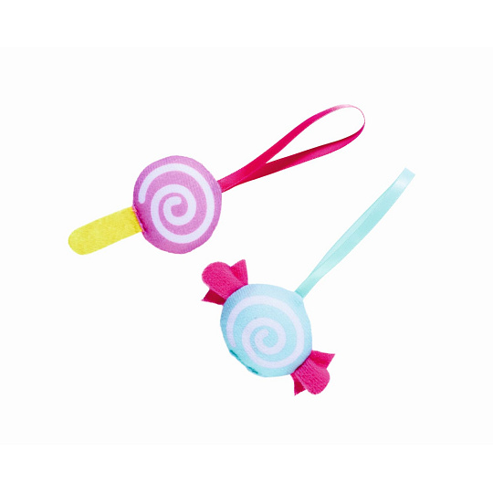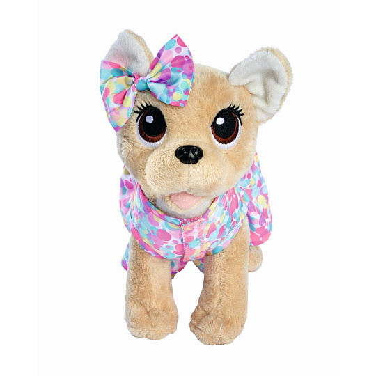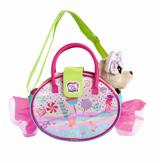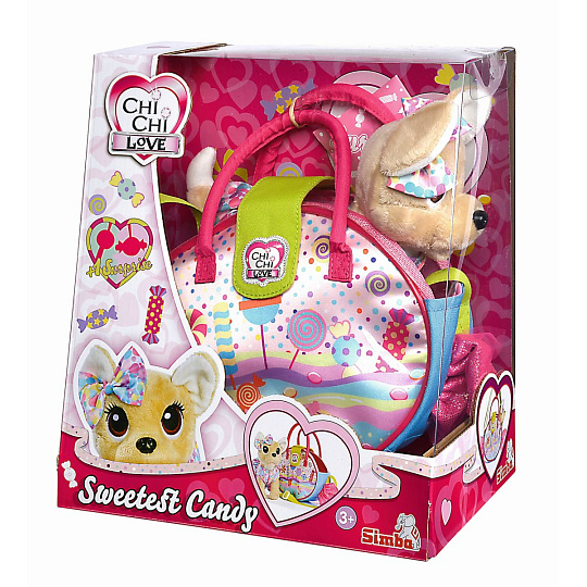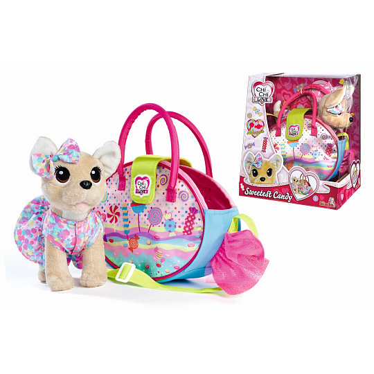 Plyšový pejsek čivava v tašce s motivy bonbonků, vč. popruhu pro nošení přes rameno. Velikost 20 cm.