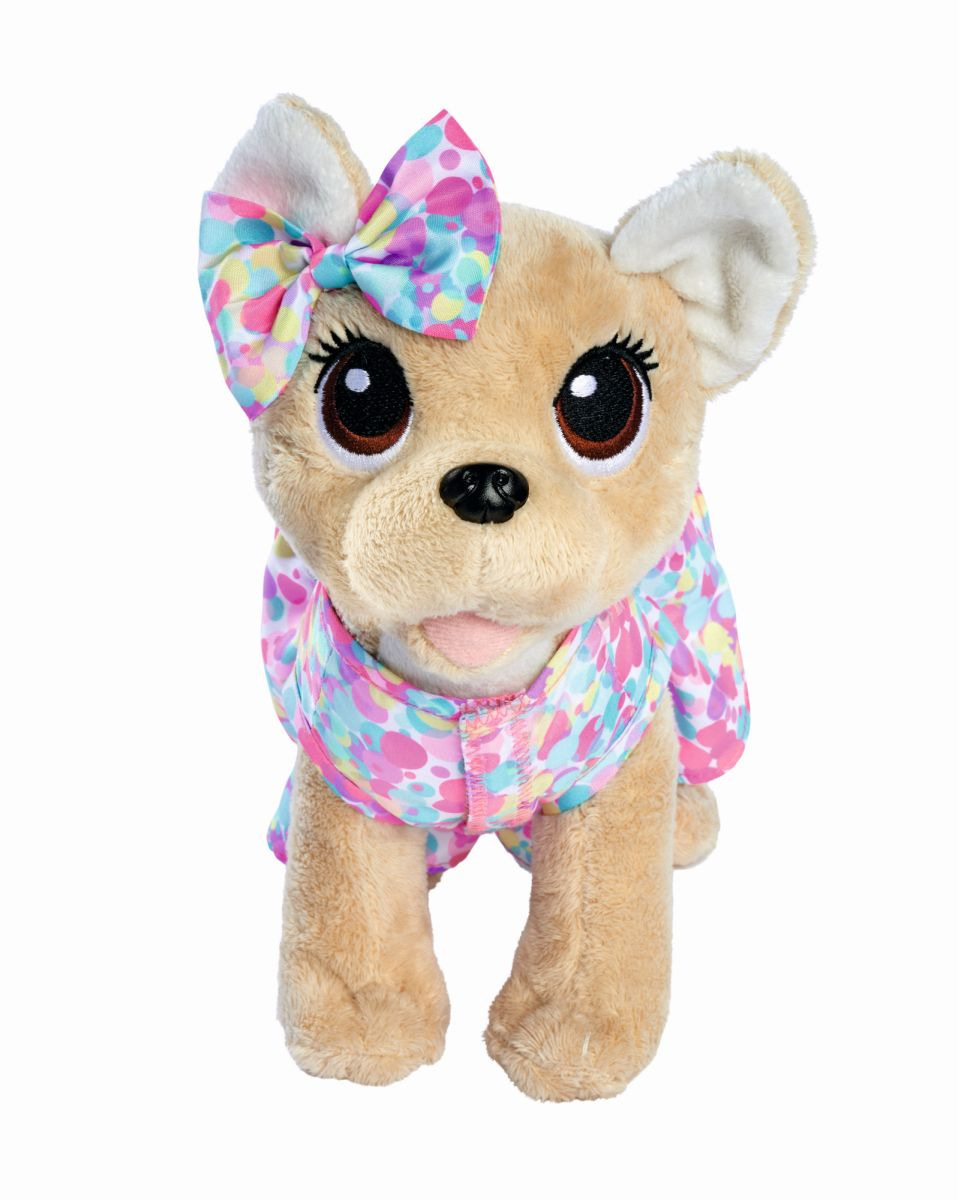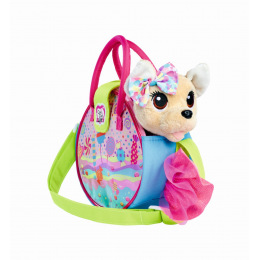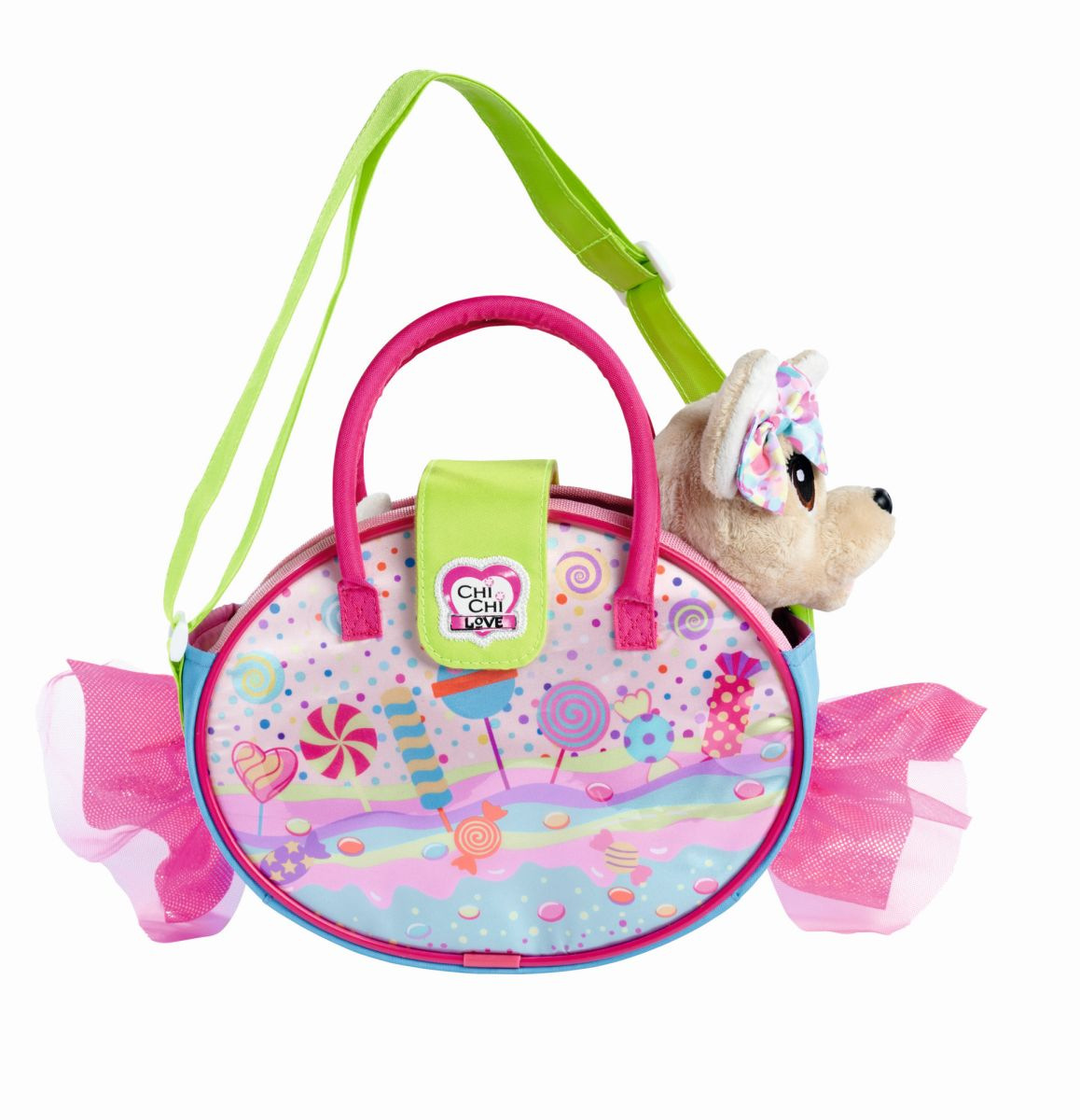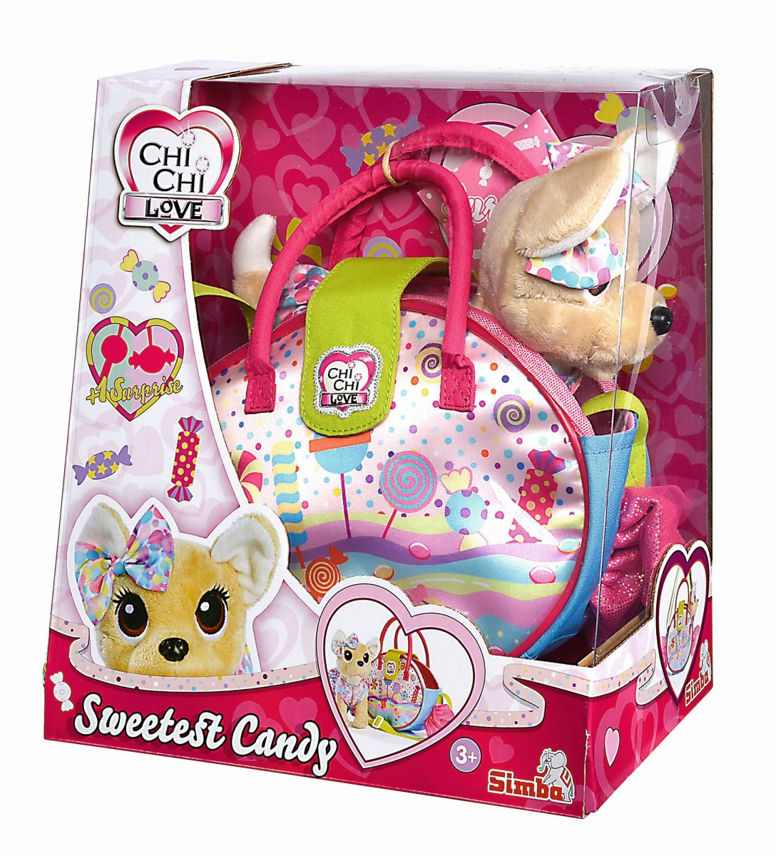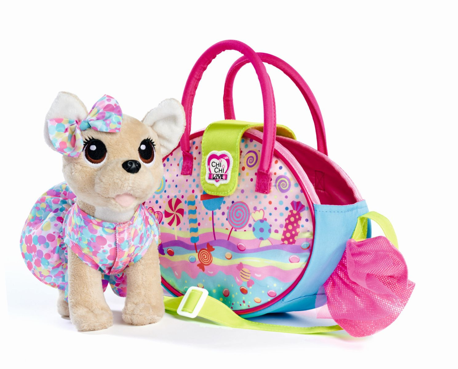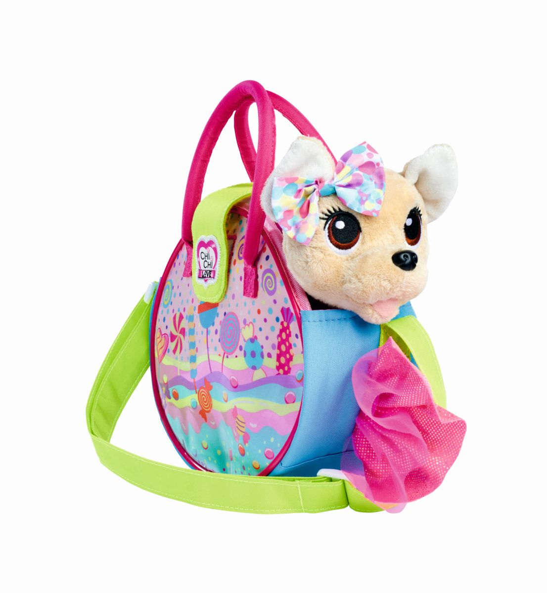 Plyšový pejsek čivava v tašce s motivy bonbonků, vč. popruhu pro nošení přes rameno. Velikost 20 cm.