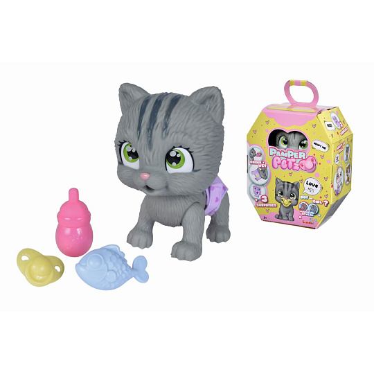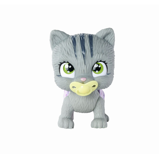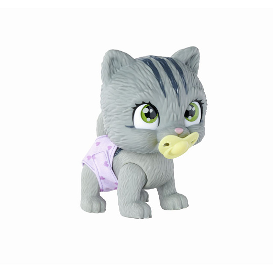 Roztomilé kočičí miminko s picí a čůrací funkcí, plenka s funkcí změny zbarvení po namočení, magická tlapka (po navlhčení se vybarví a ukáže pohlaví koťátka), adopční list a tři překvapení. Velikost 15 cm.