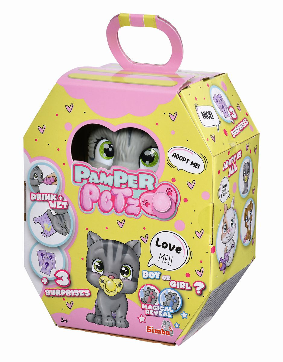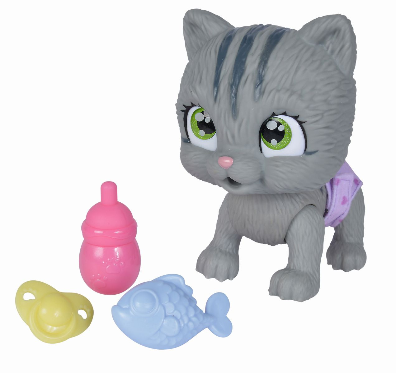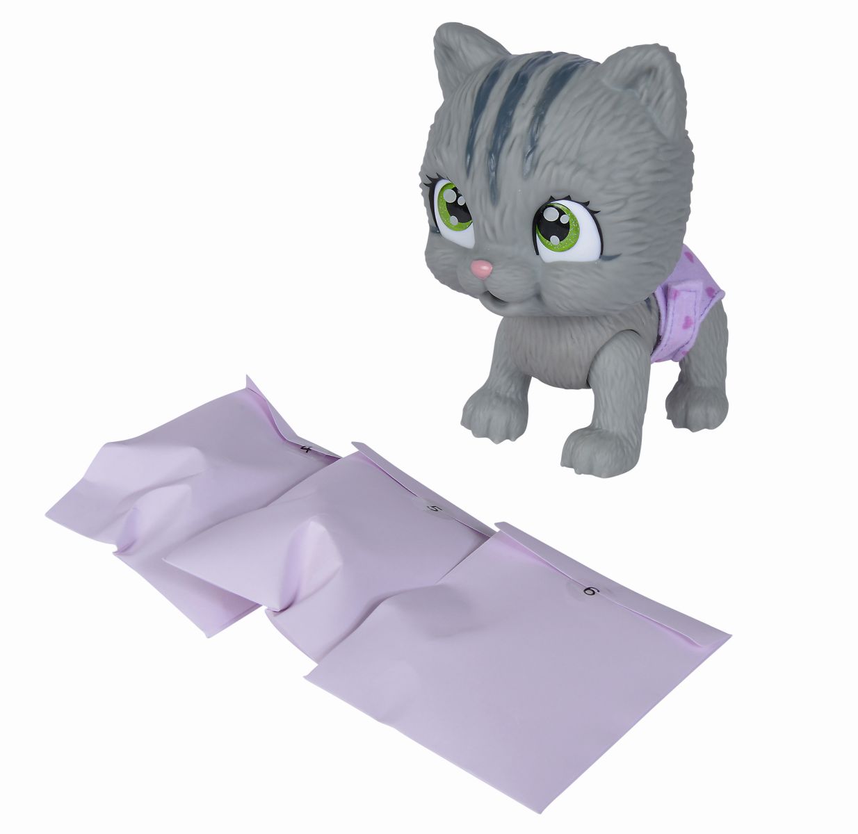 Roztomilé kočičí miminko s picí a čůrací funkcí, plenka s funkcí změny zbarvení po namočení, magická tlapka (po navlhčení se vybarví a ukáže pohlaví koťátka), adopční list a tři překvapení. Velikost 15 cm.