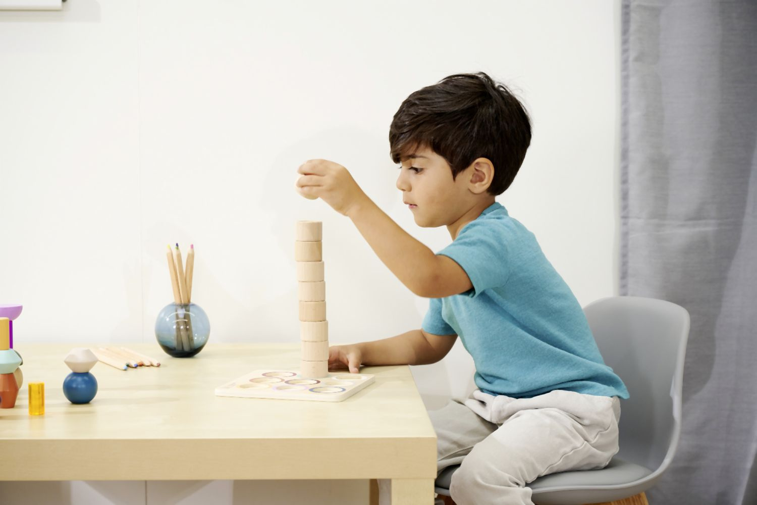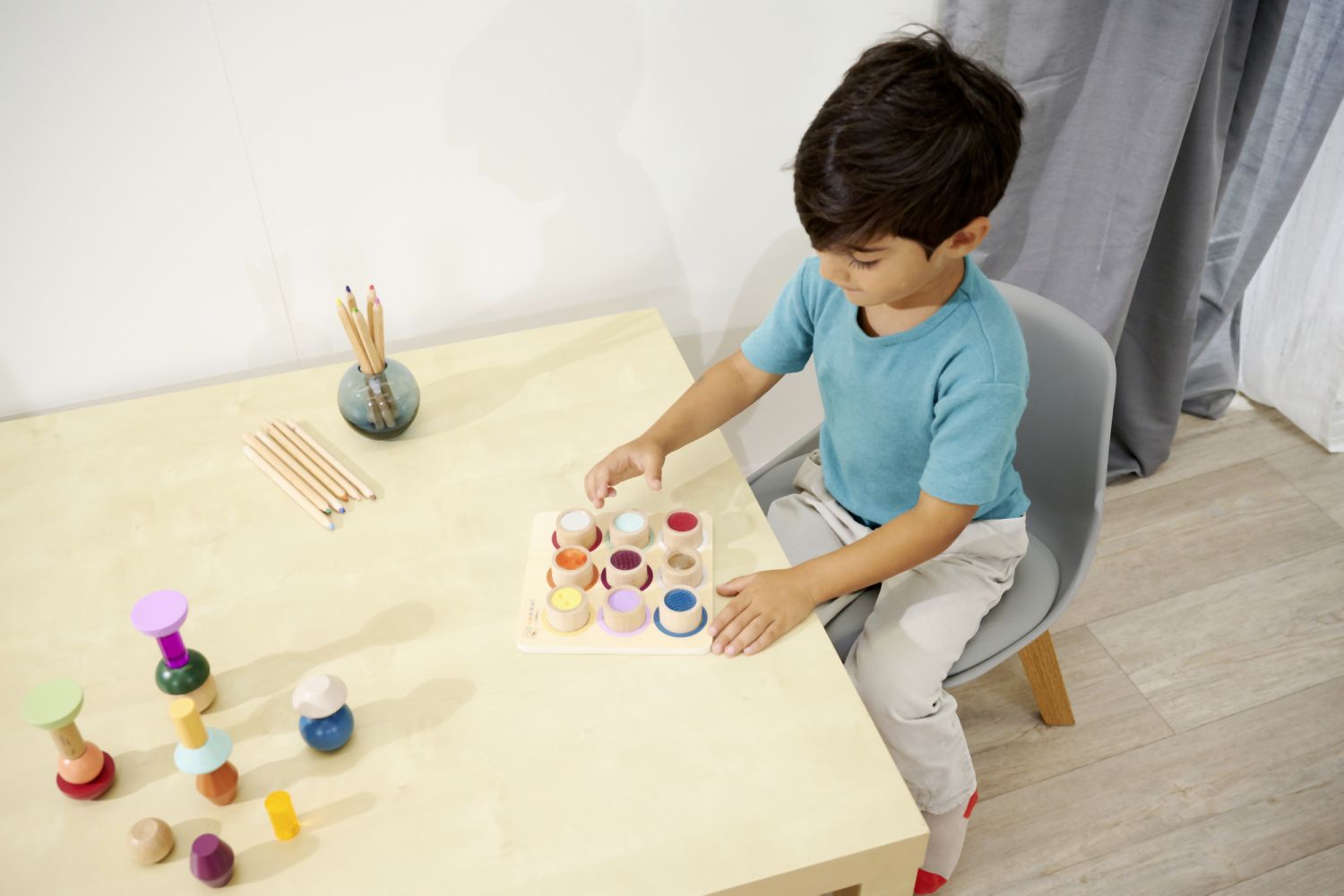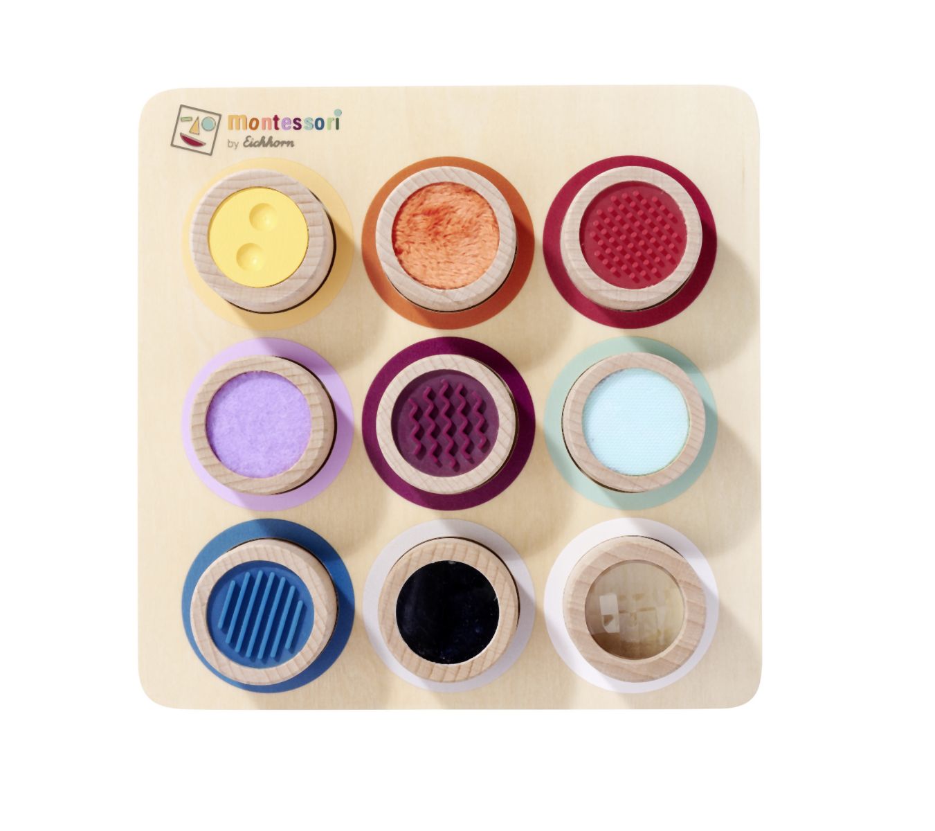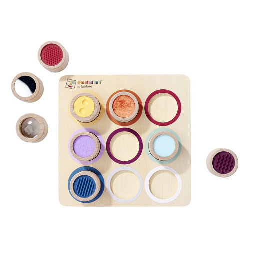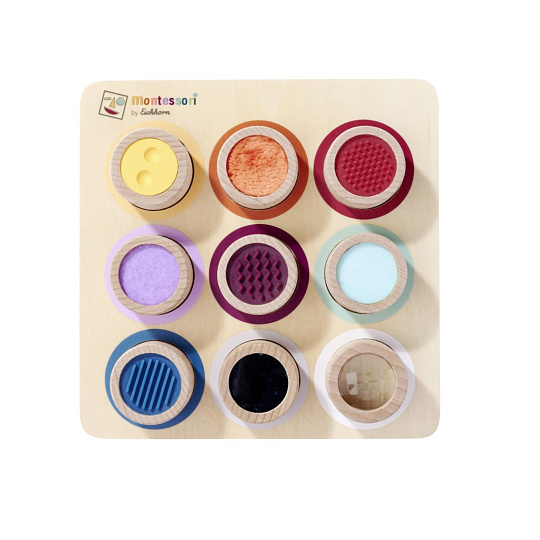 Vnímání je pro dítě důležitým smyslovým vývojem. Hra s různými povrchy a materiály podporuje hmat. Naše Montessori hmatová deska má 9 senzorických válců, ve kterých si dítě může osahat povrchy a textury. Montessori hmatová deska je vyrobena ze 100% bukového dřeva a překližky s certifikací FSC a je vhodná pro děti od 3 let.