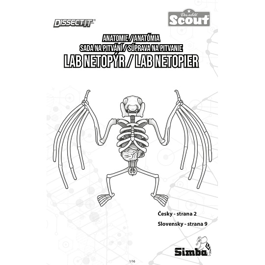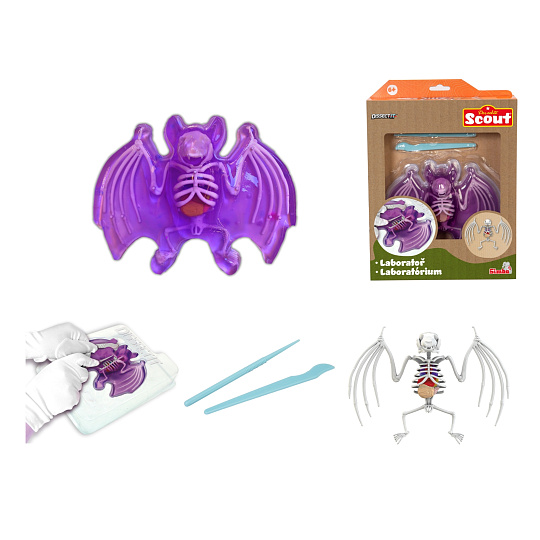 Sada s nástroji k pitvě netopýra, jehož kosti a orgány jsou pokryty fialovým slizem. Prvky lze vyjmout a prozkoumat jednotlivě. Součástí je sáček s práškem pro vytvoření opětovného slizu. Po dokončení první pitvy vložte orgány a kostru zpět do blistru, promíchejte prášek s vodou, zalijte vzniklým slizem a nechte ztuhnout v chladu. Netopýra pak lze pitvat podruhé. Velikost 15 cm.