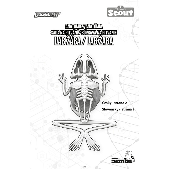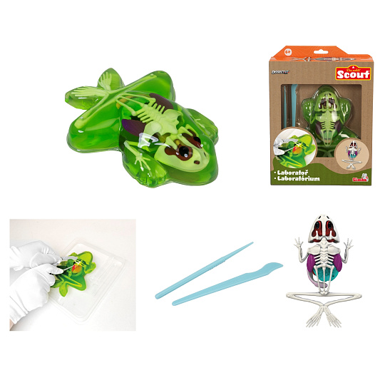 Sada s nástroji k pitvě žáby, jejiž kosti a orgány jsou pokryty zeleným slizem. Prvky lze vyjmout a prozkoumat jednotlivě. Součástí je sáček s práškem pro vytvoření opětovného slizu. Po dokončení první pitvy vložte orgány a kostru zpět do blistru, promíchejte prášek s vodou, zalijte vzniklým slizem a nechte ztuhnout v chladu. Žábu pak lze pitvat podruhé. Velikost 16 cm.