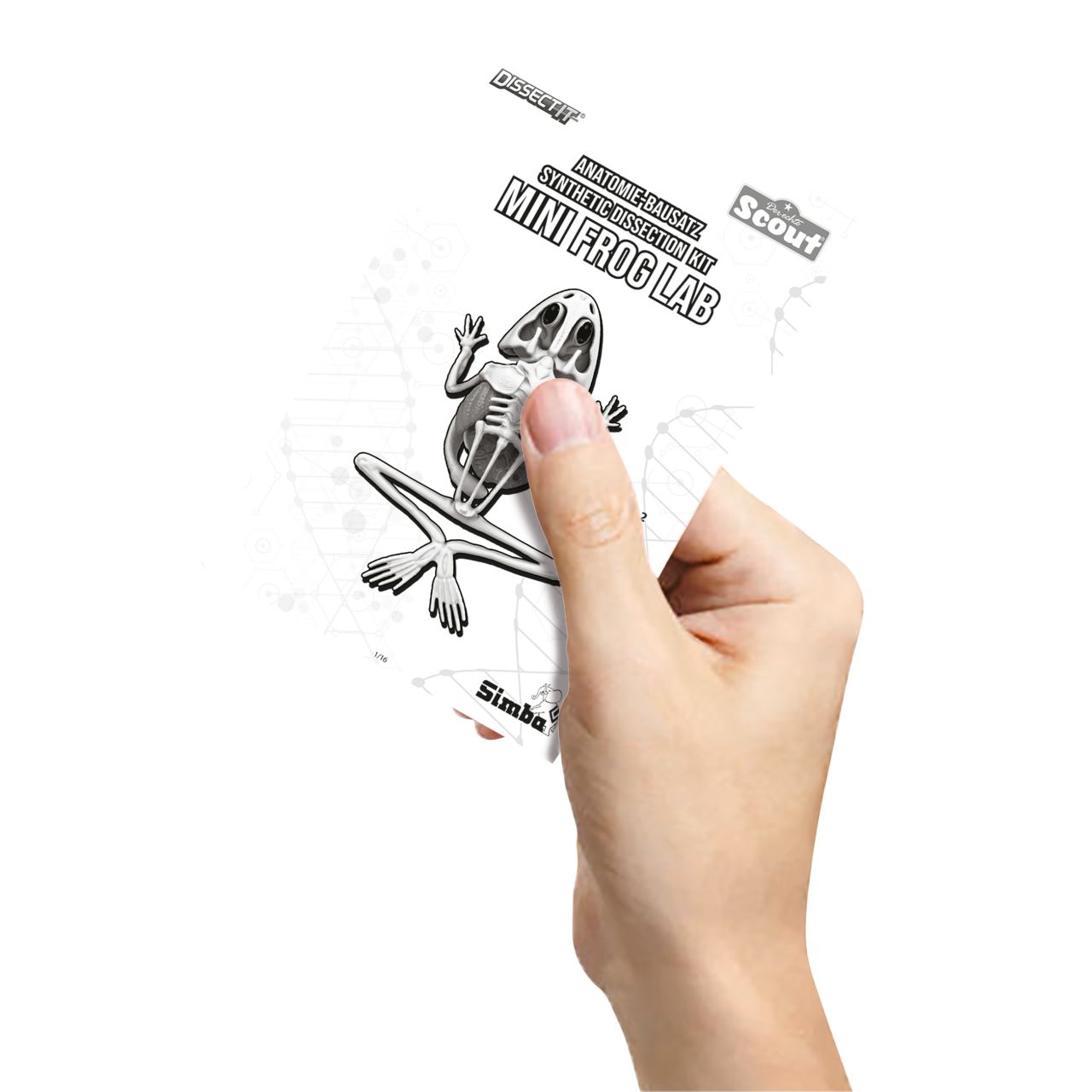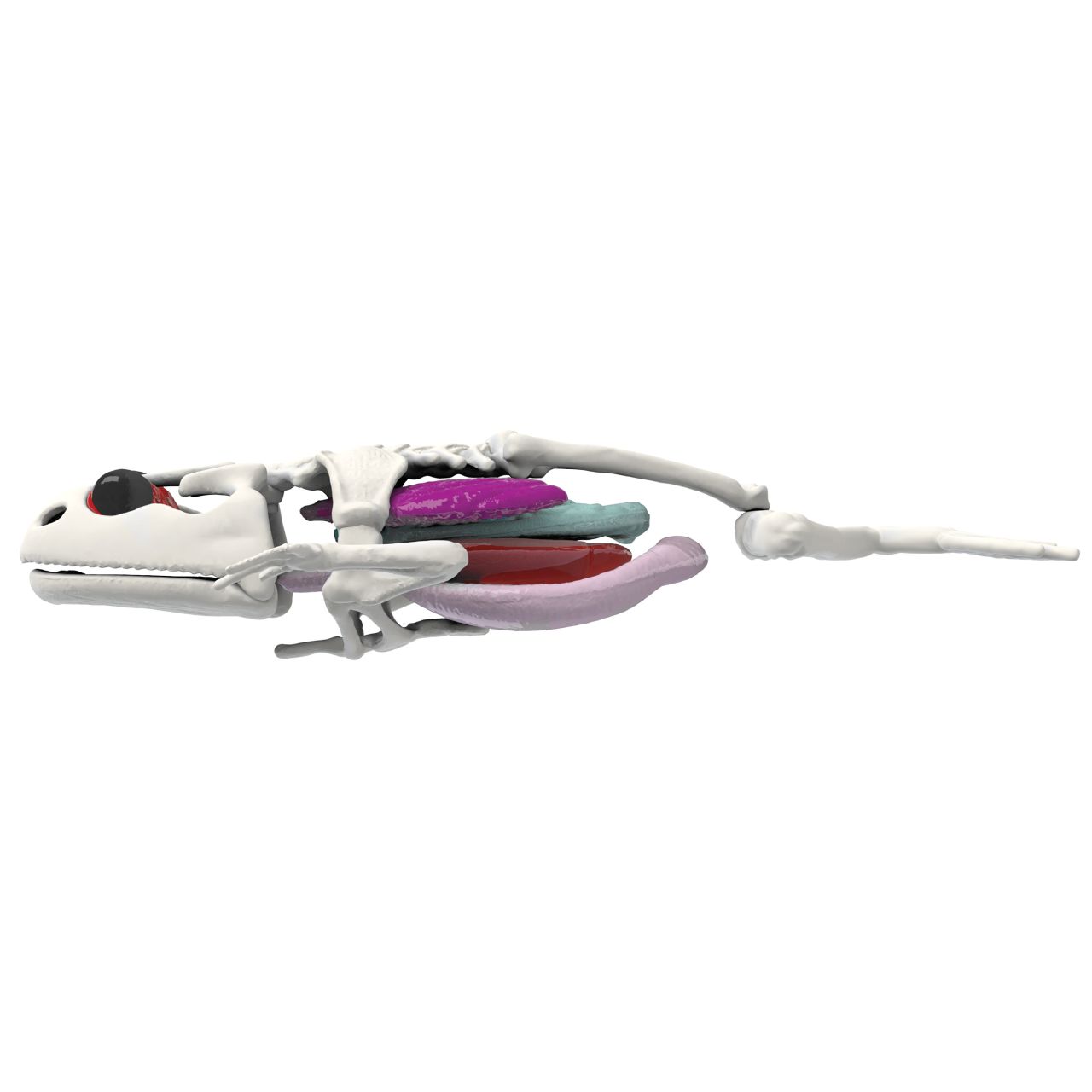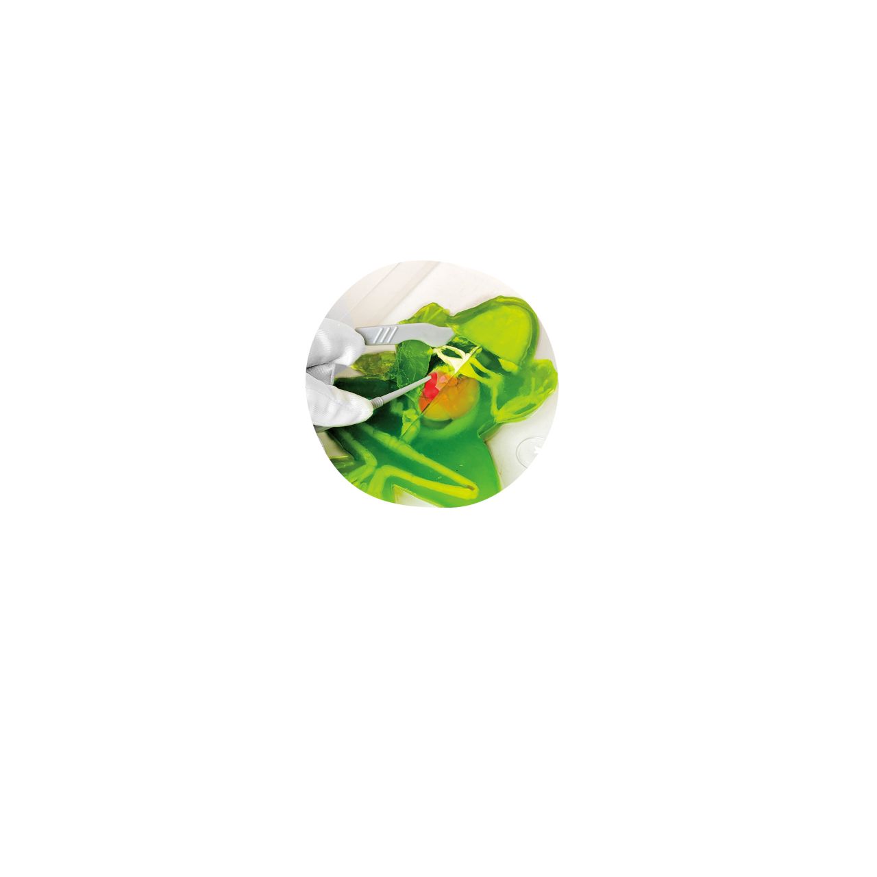 Sada s nástroji k pitvě žáby, jejiž kosti a orgány jsou pokryty zeleným slizem. Prvky lze vyjmout a prozkoumat jednotlivě. Součástí je sáček s práškem pro vytvoření opětovného slizu. Po dokončení první pitvy vložte orgány a kostru zpět do blistru, promíchejte prášek s vodou, zalijte vzniklým slizem a nechte ztuhnout v chladu. Žábu pak lze pitvat podruhé. Velikost 16 cm.