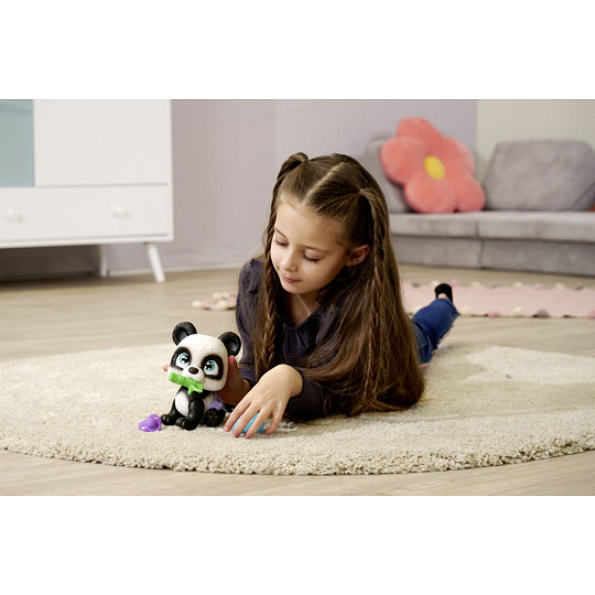 Roztomilé miminko pandy s picí a čůrací funkcí, plenka s funkcí změny zbarvení po namočení, magická tlapka (po navlhčení se vybarví a ukáže pohlaví pandy), adopční list a tři překvapení. Velikost 15 cm.