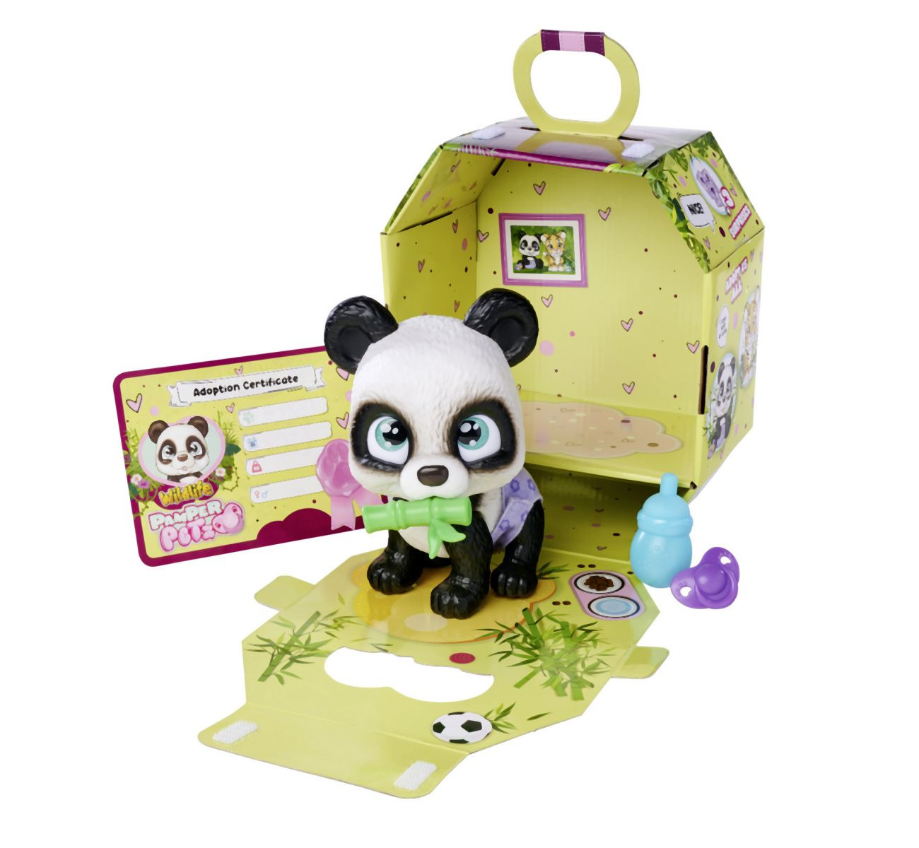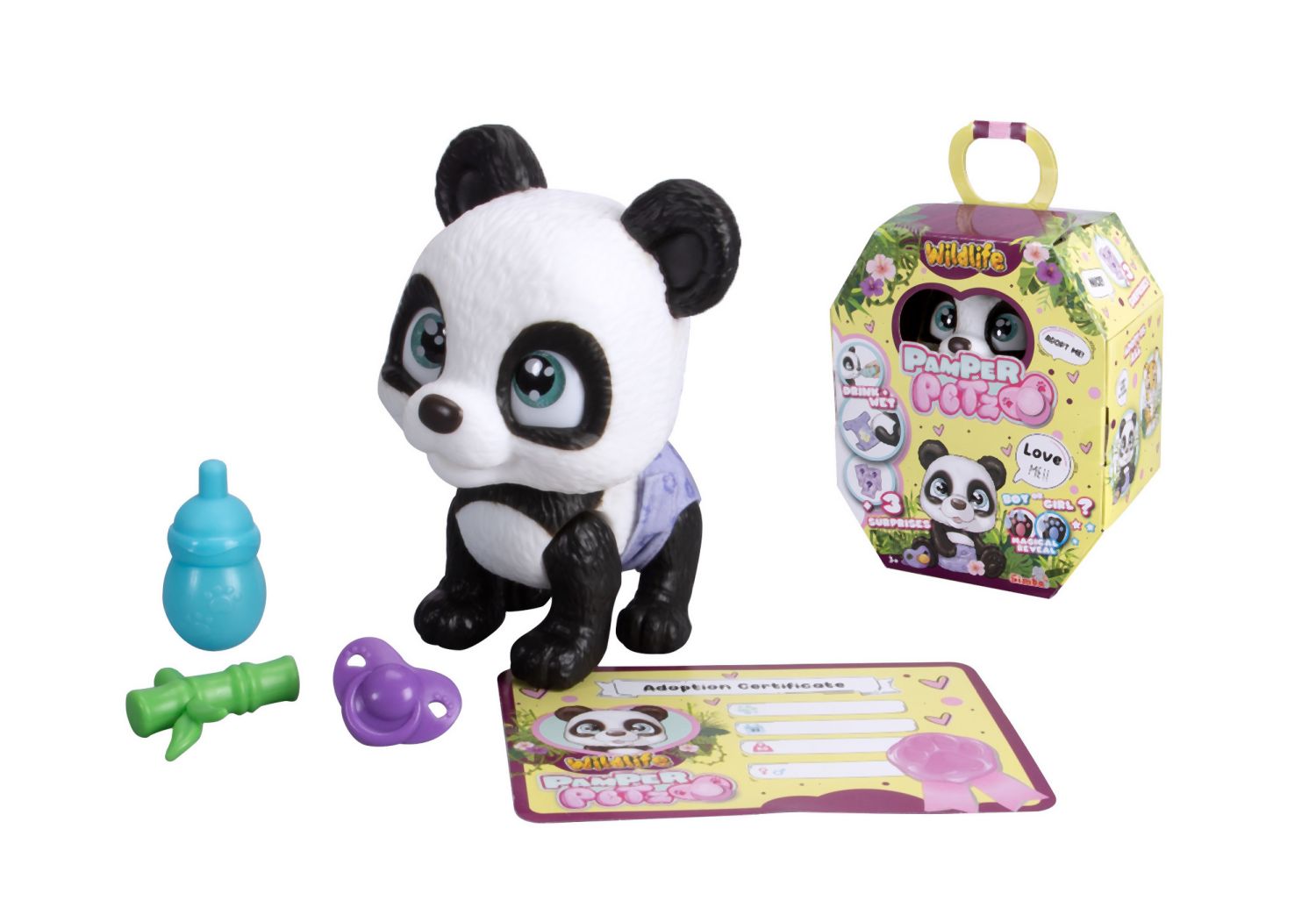 Roztomilé miminko pandy s picí a čůrací funkcí, plenka s funkcí změny zbarvení po namočení, magická tlapka (po navlhčení se vybarví a ukáže pohlaví pandy), adopční list a tři překvapení. Velikost 15 cm.