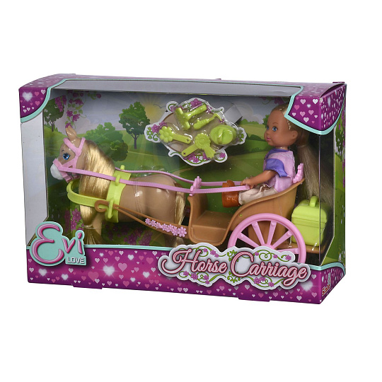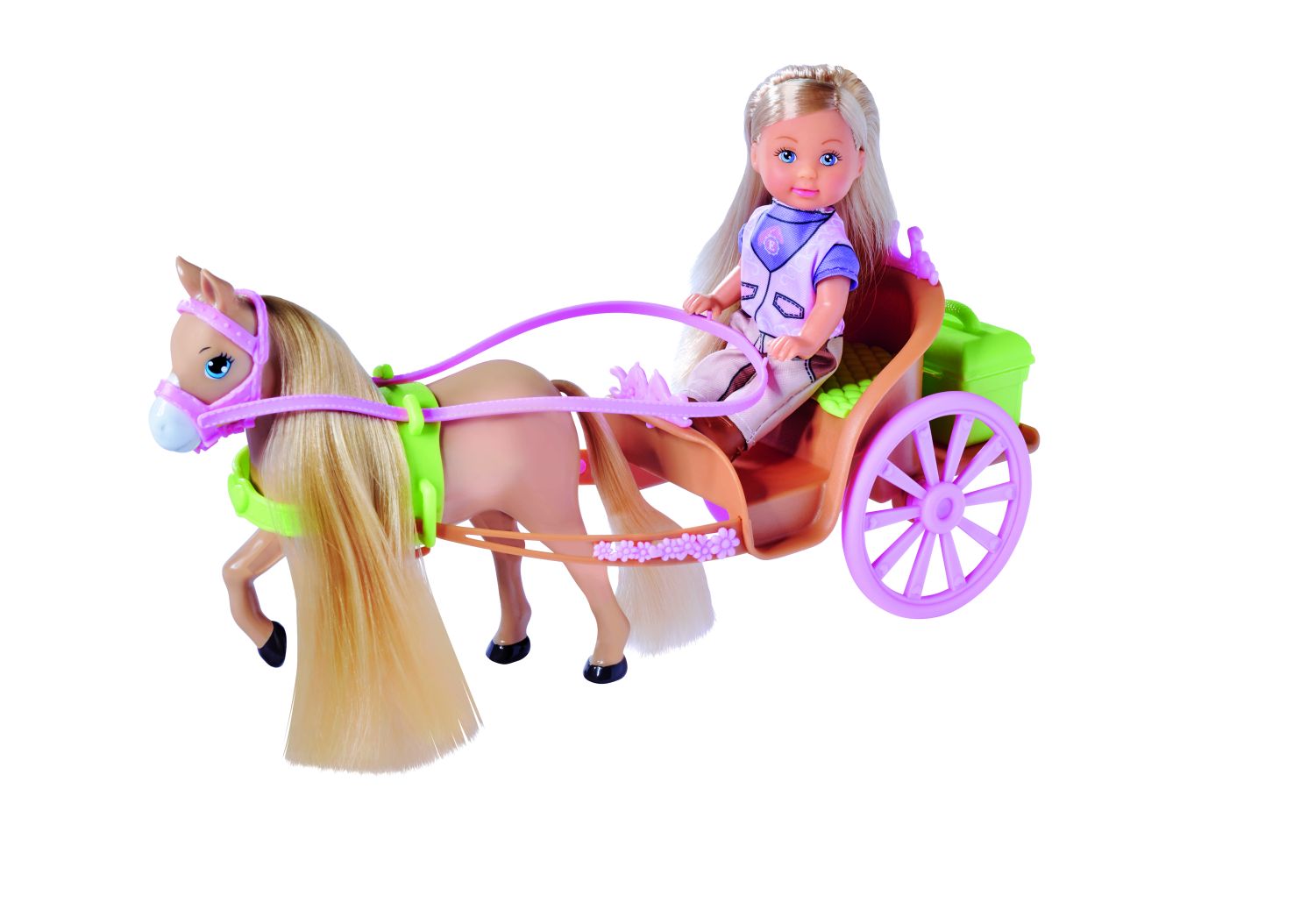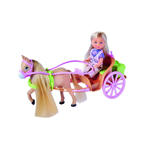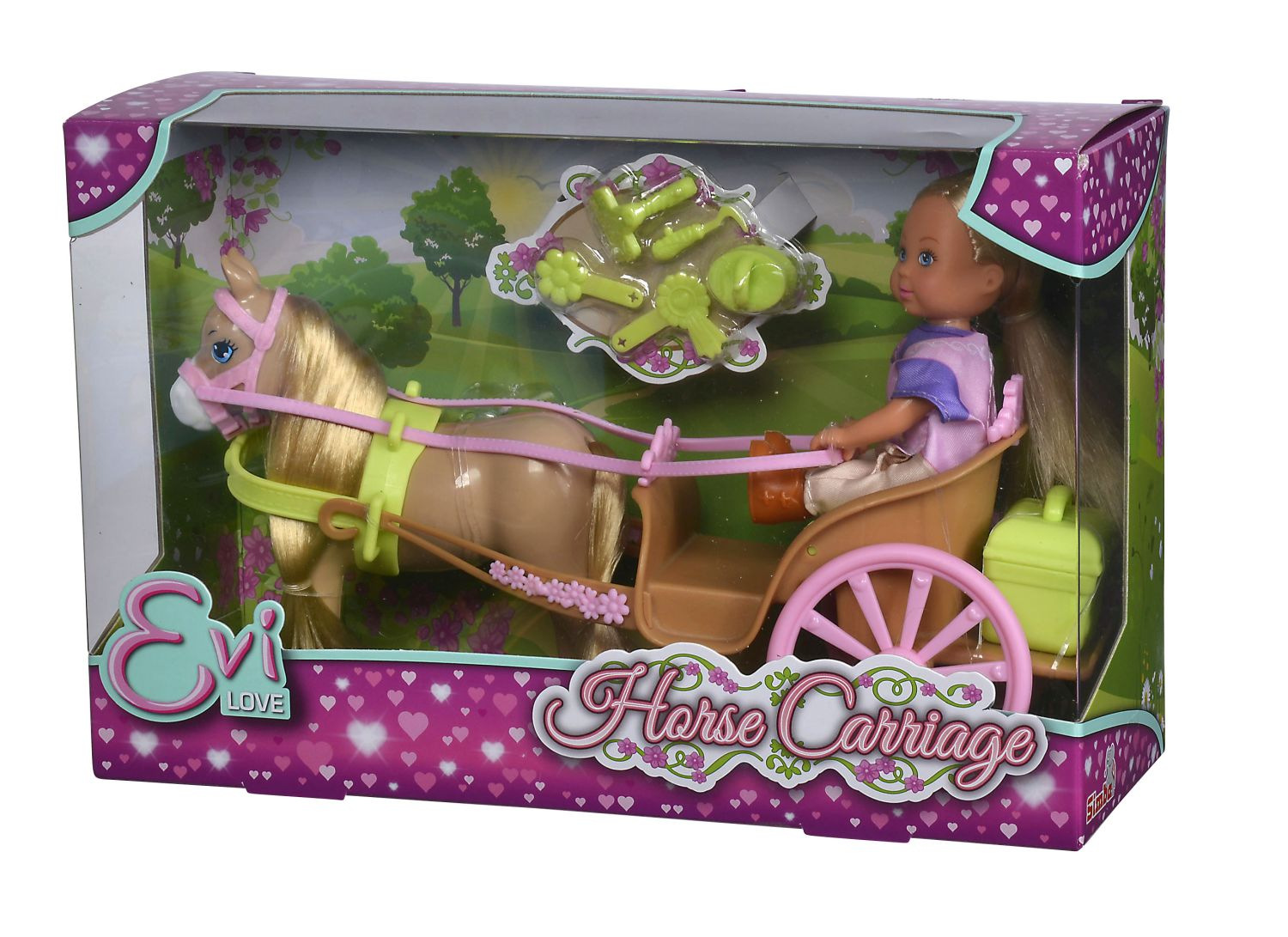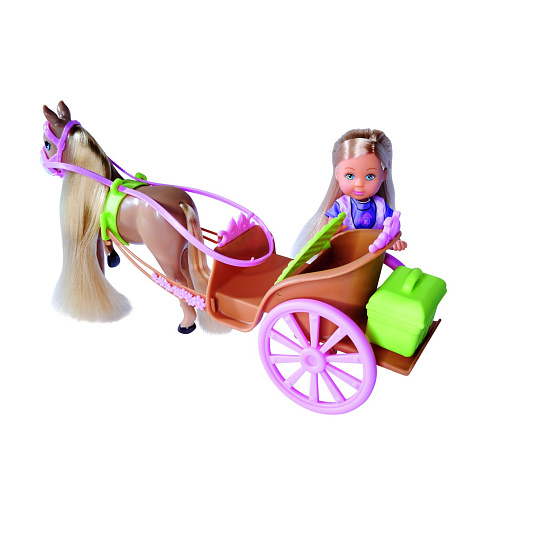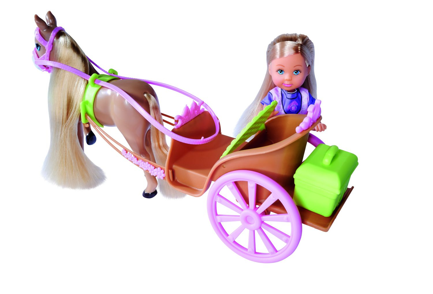 Panenka Evička s kočárem taženým jedním koněm, tajná přihrádka a příslušenství součástí. Délka povozu 28 cm. Výška panenky 12 cm.