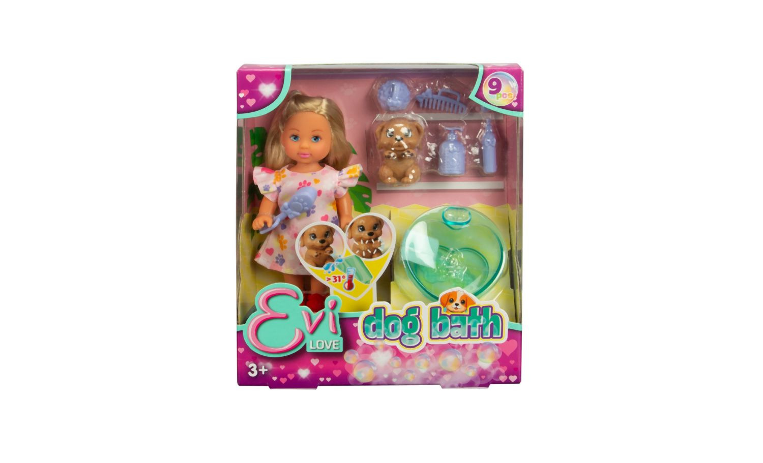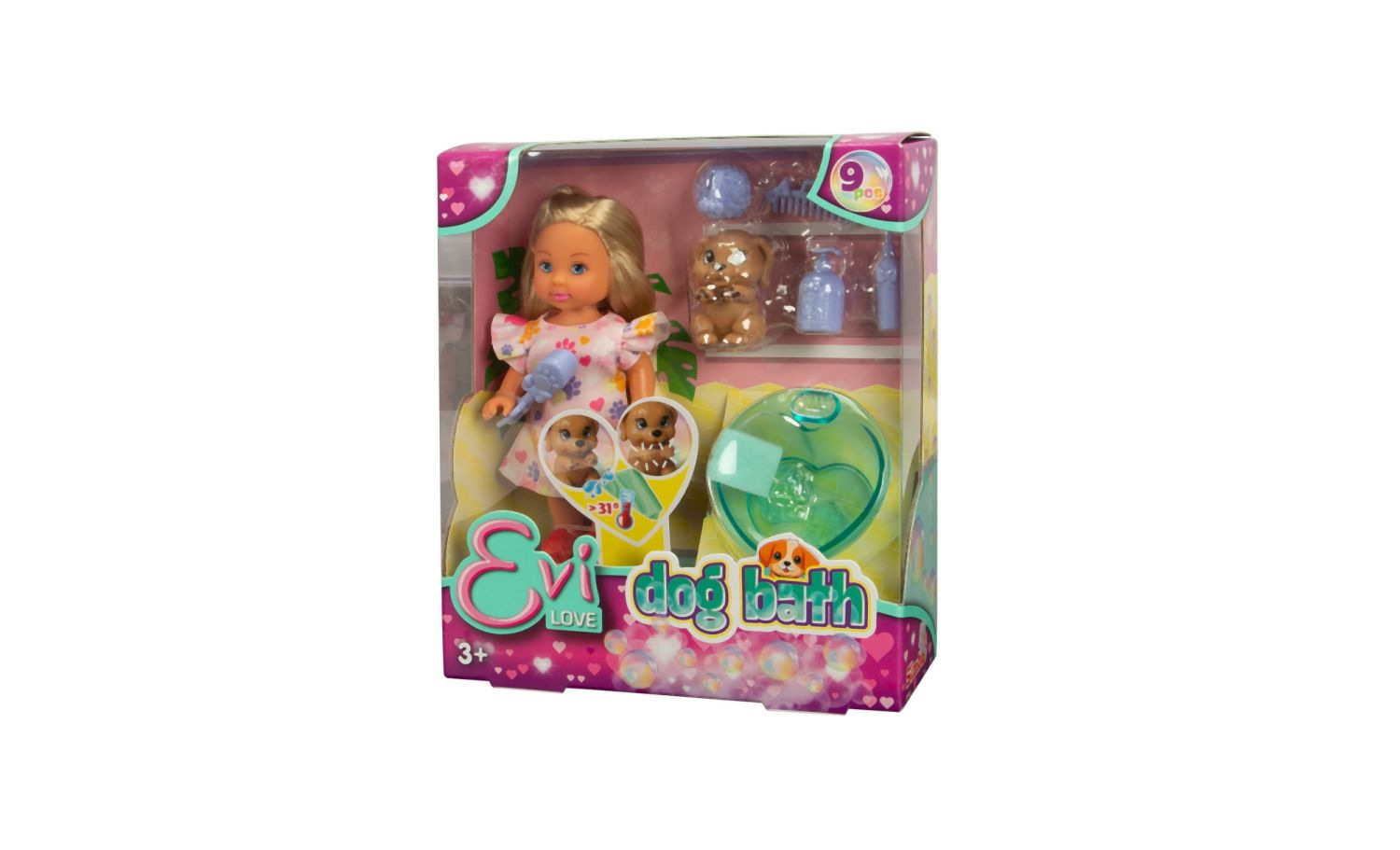 Panenka Evička s pejskem, který má špinavé pacičky. Součástí balení je celkem 8 doplňků, např. vana a ručník. Velikost panenky 12 cm.
