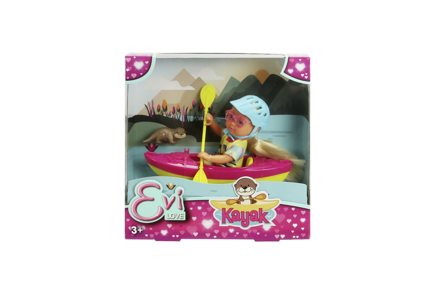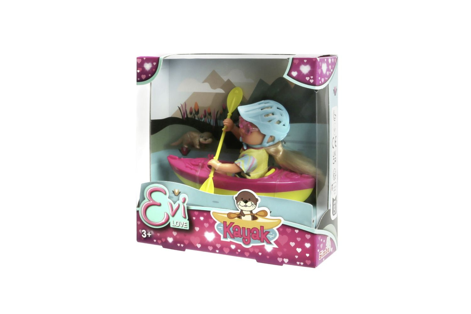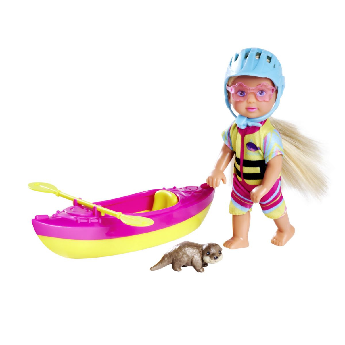 Panenka Evička připravená na výlet s kajakem. Součástí balení je oblečení, kajak, helma, pádlo, sluneční brýle a vydra. Velikost panenky 12 cm.
