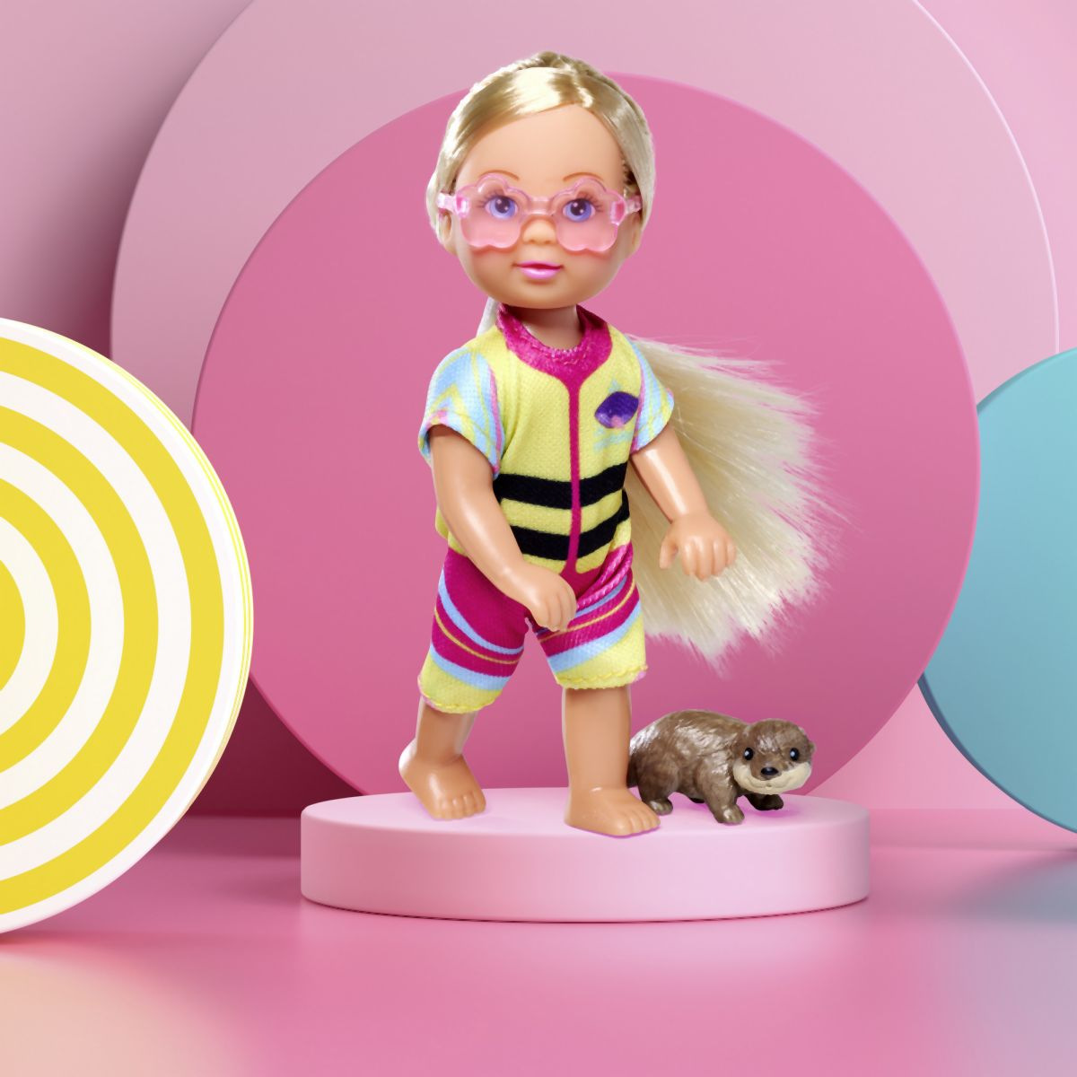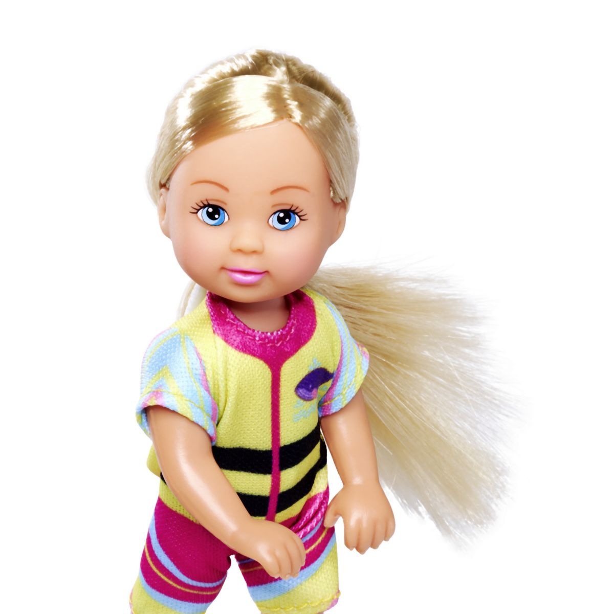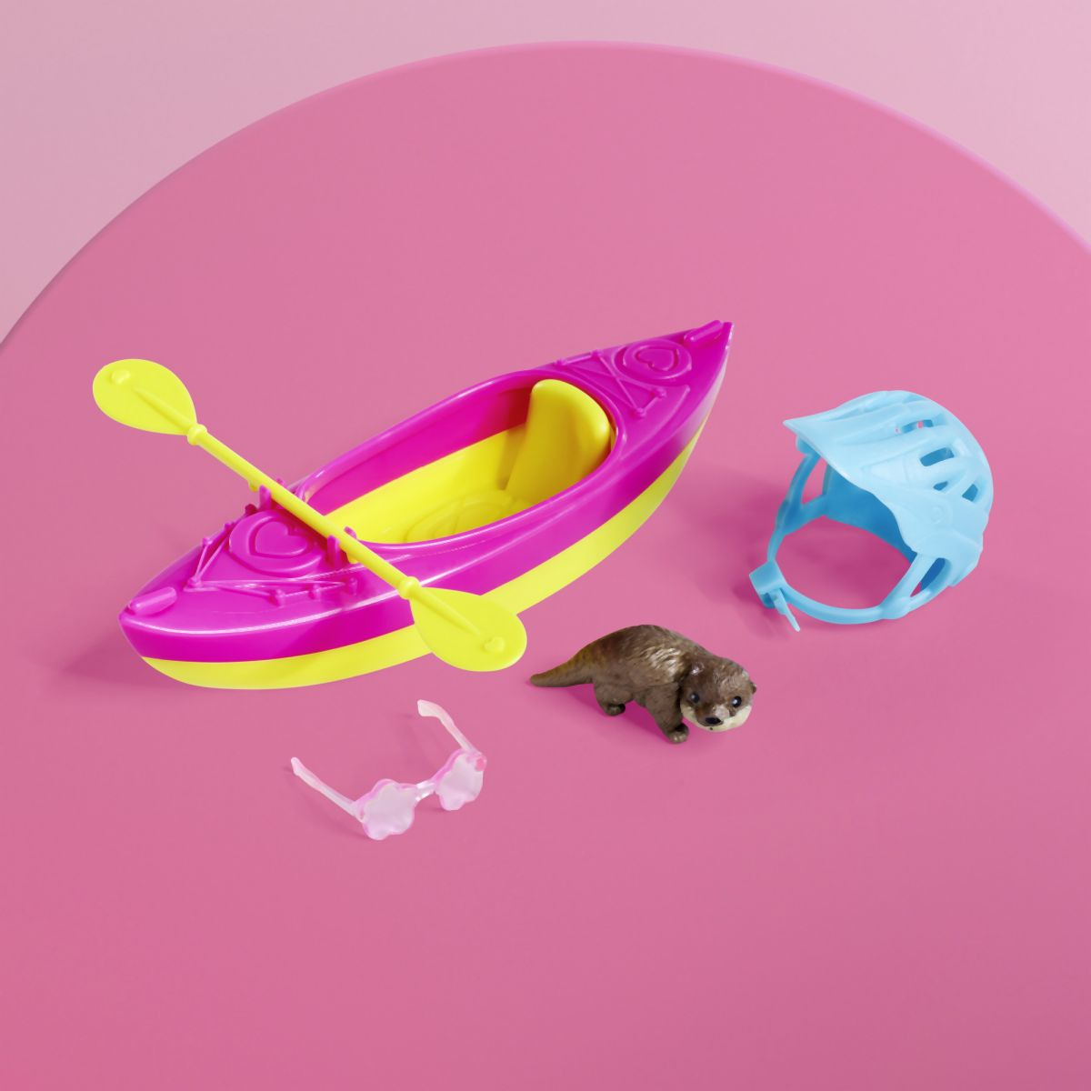Panenka Evička připravená na výlet s kajakem. Součástí balení je oblečení, kajak, helma, pádlo, sluneční brýle a vydra. Velikost panenky 12 cm.