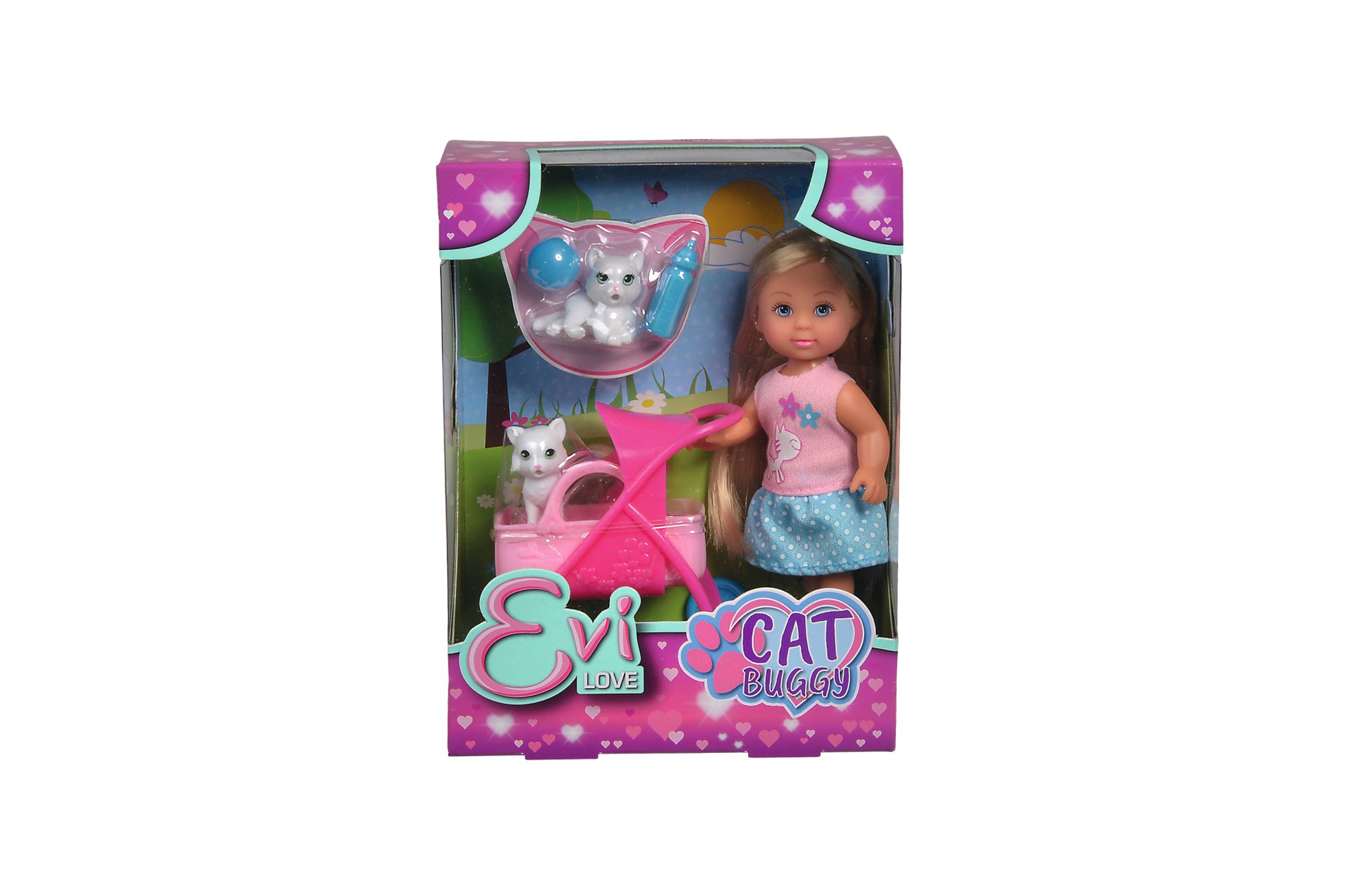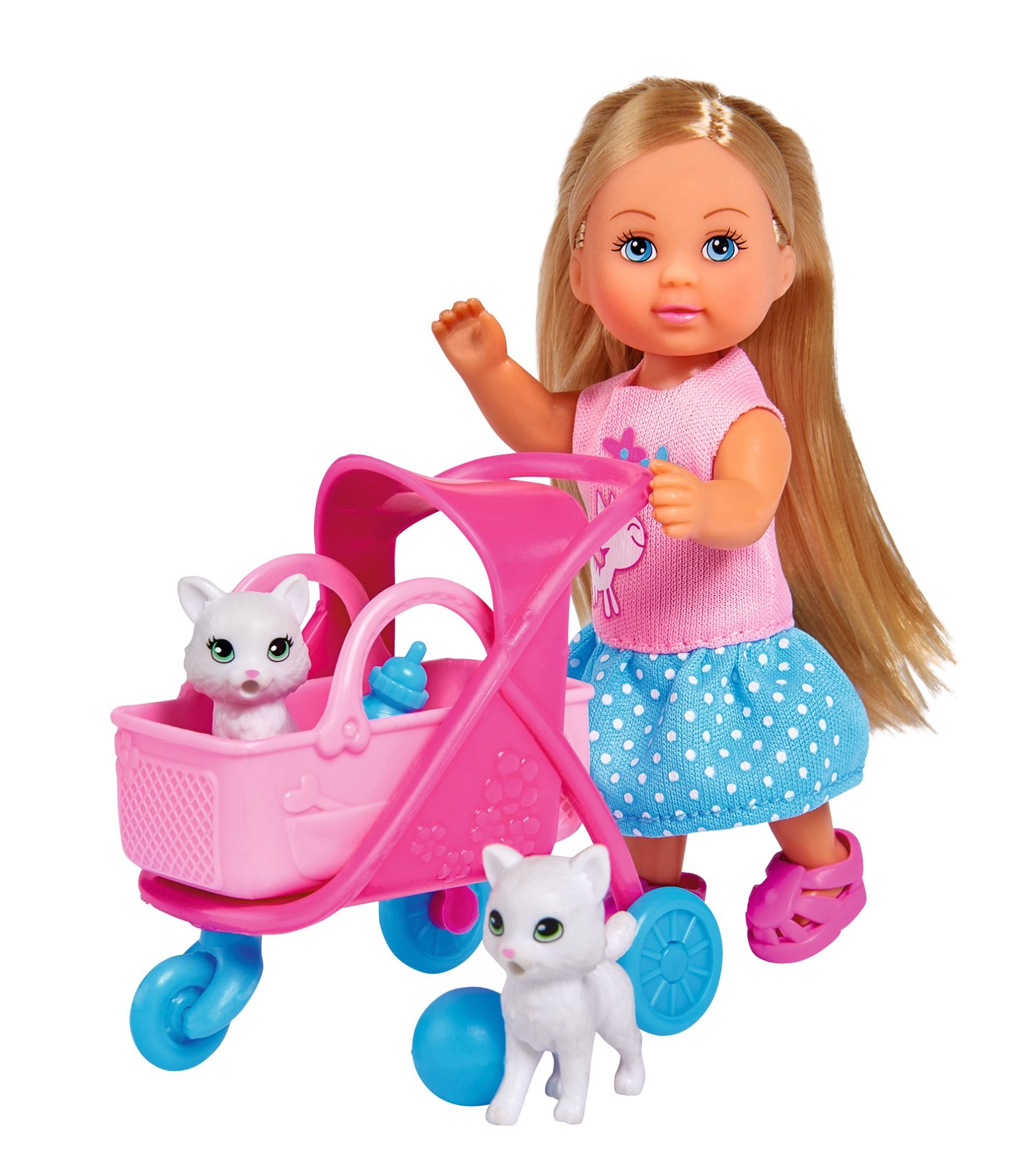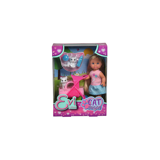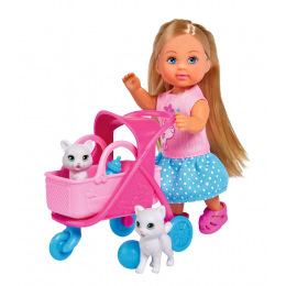 Panenka Evička se 2 roztomilými kočičkami a kočárkem s odnímatelným košíkem a doplňky. Velikost panenky 12 cm.