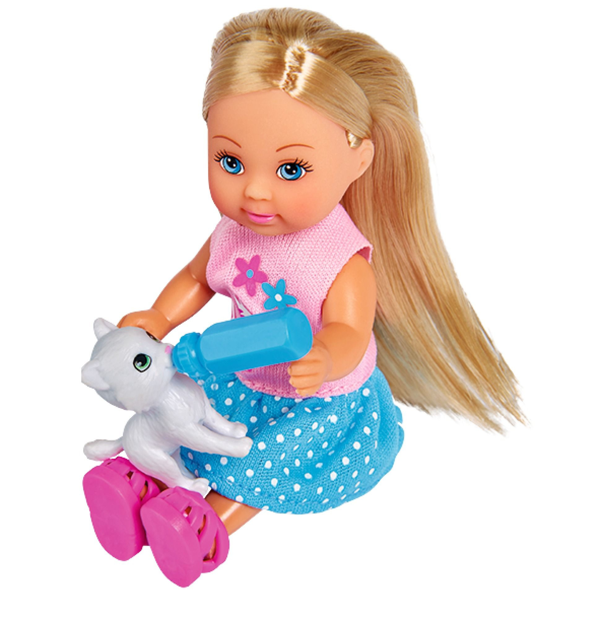Panenka Evička má svého zvířecího mazlíčka. 3 druhy zvířátek: králíček, pejsek nebo kočička. Výška panenky 12 cm.