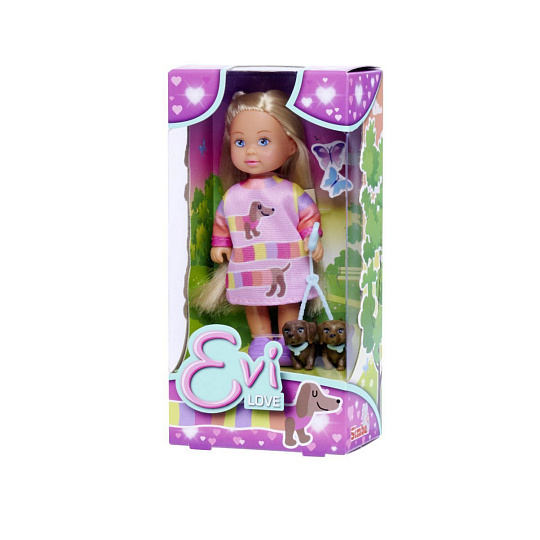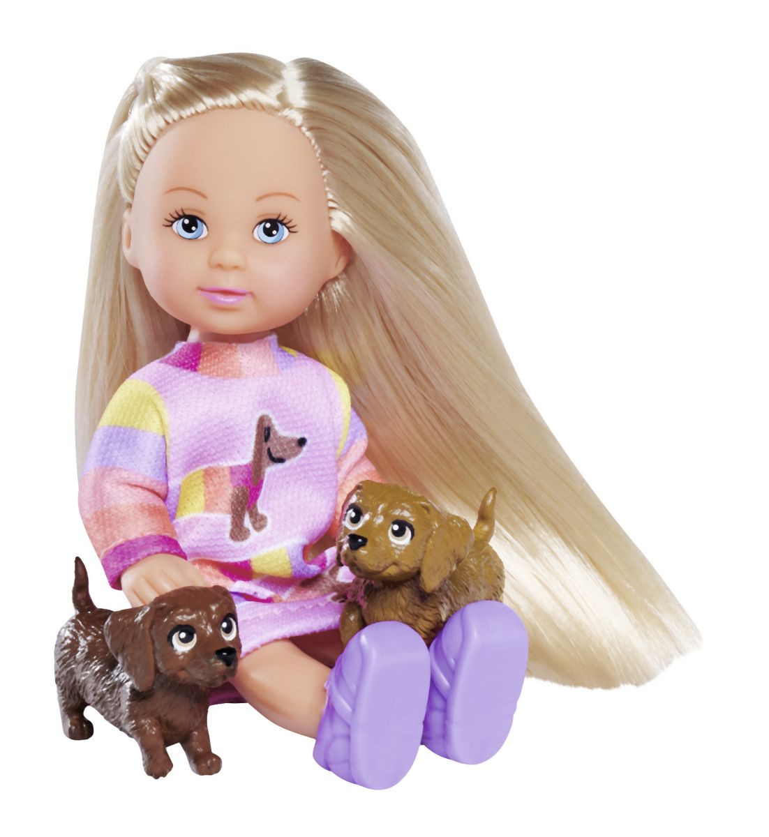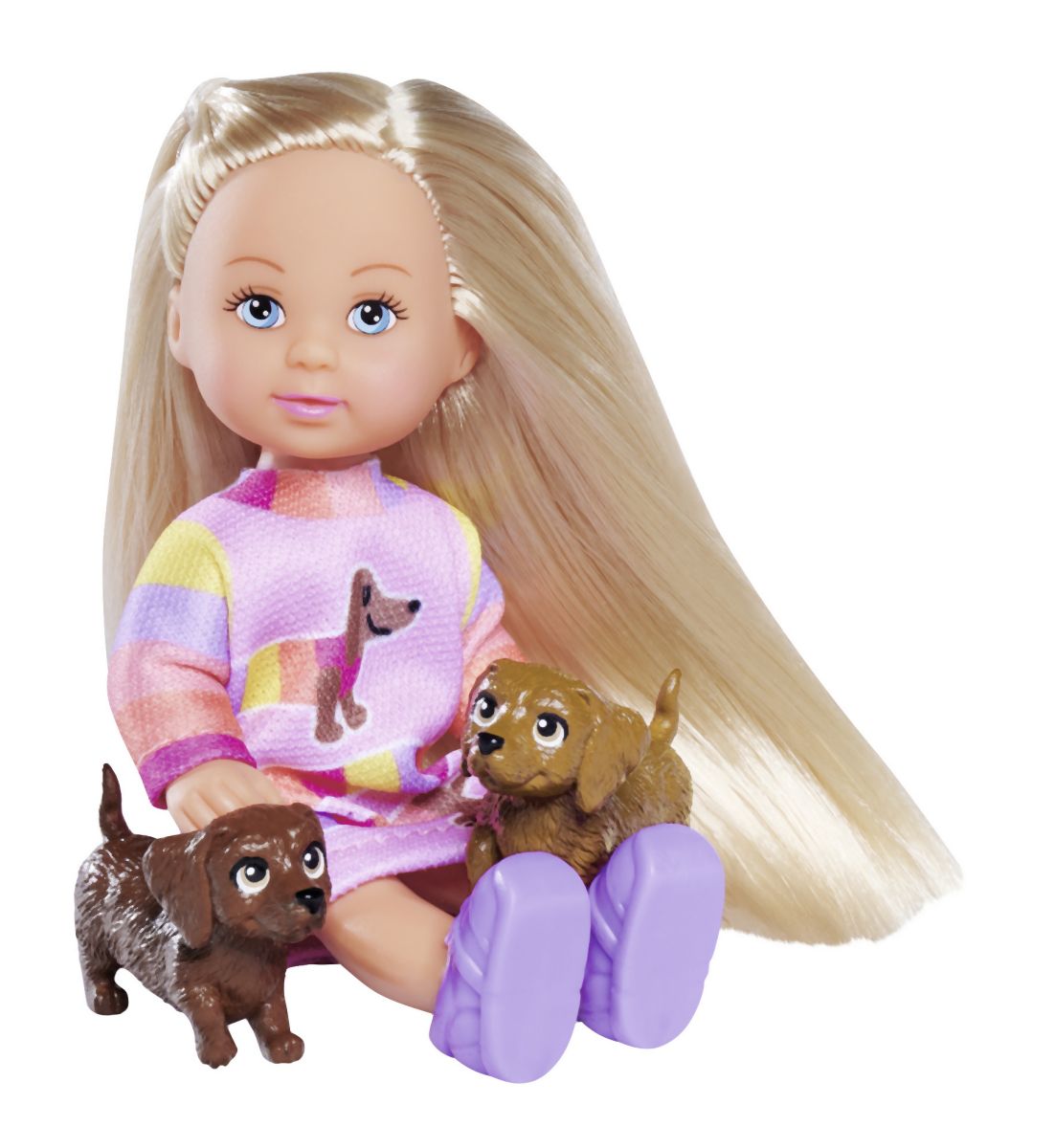 Panenka Evička s 2 pejsky na vodítku. Velikost panenky 12 cm.