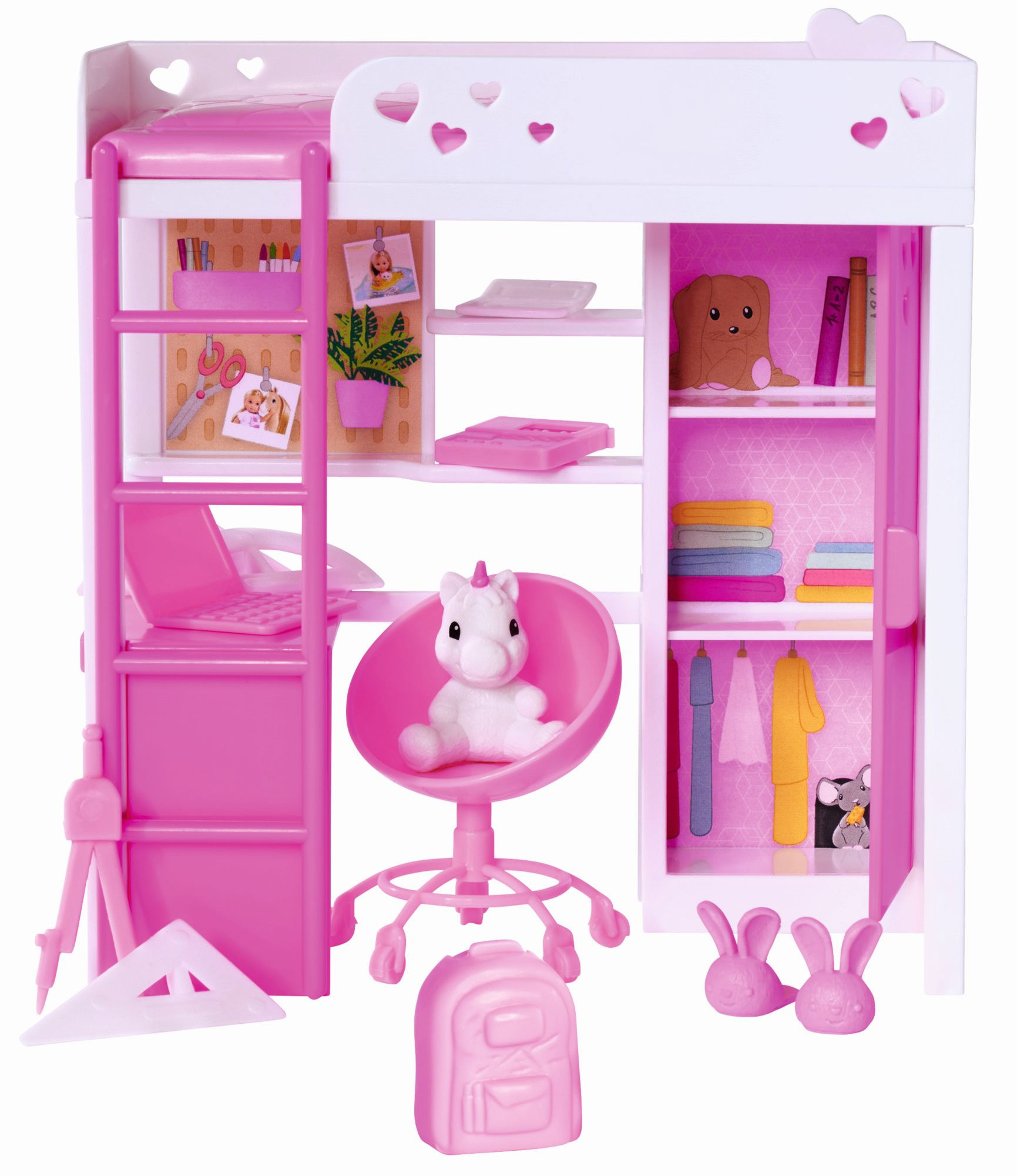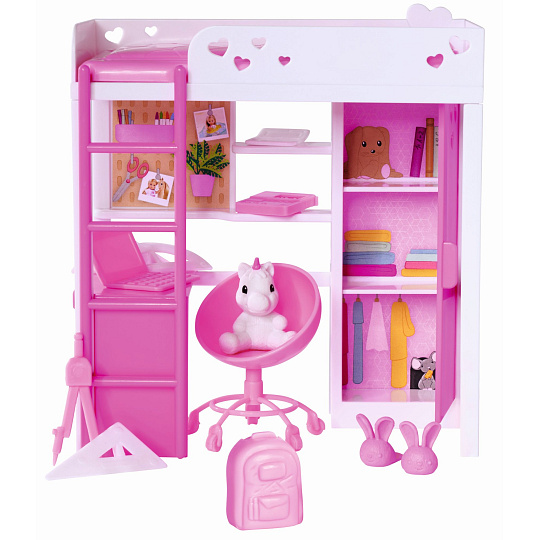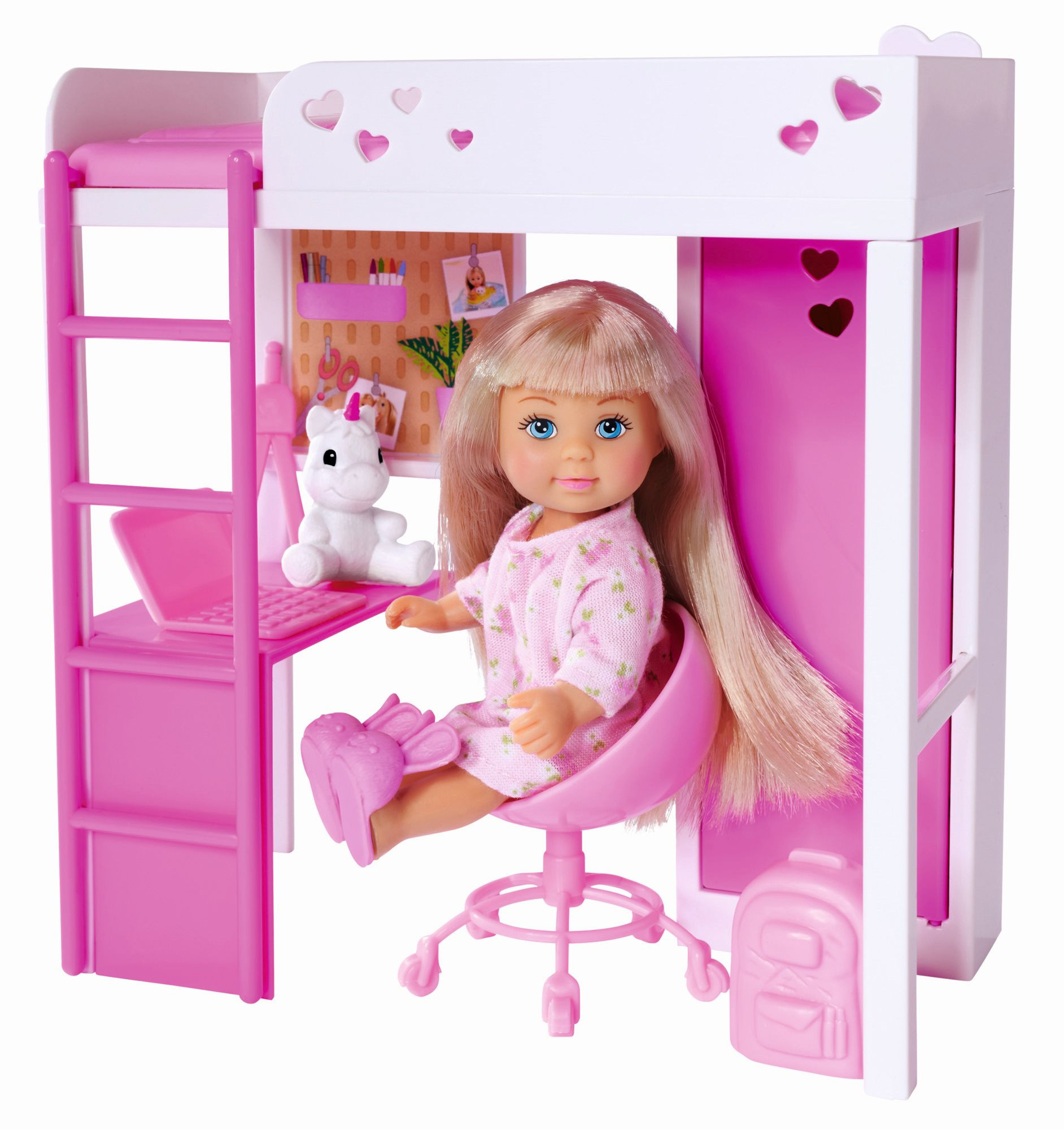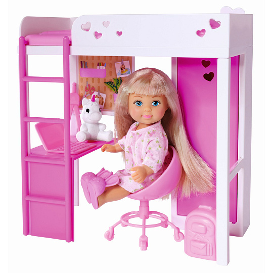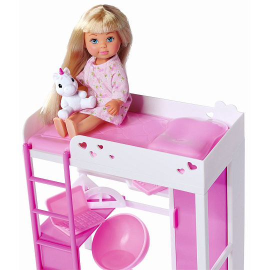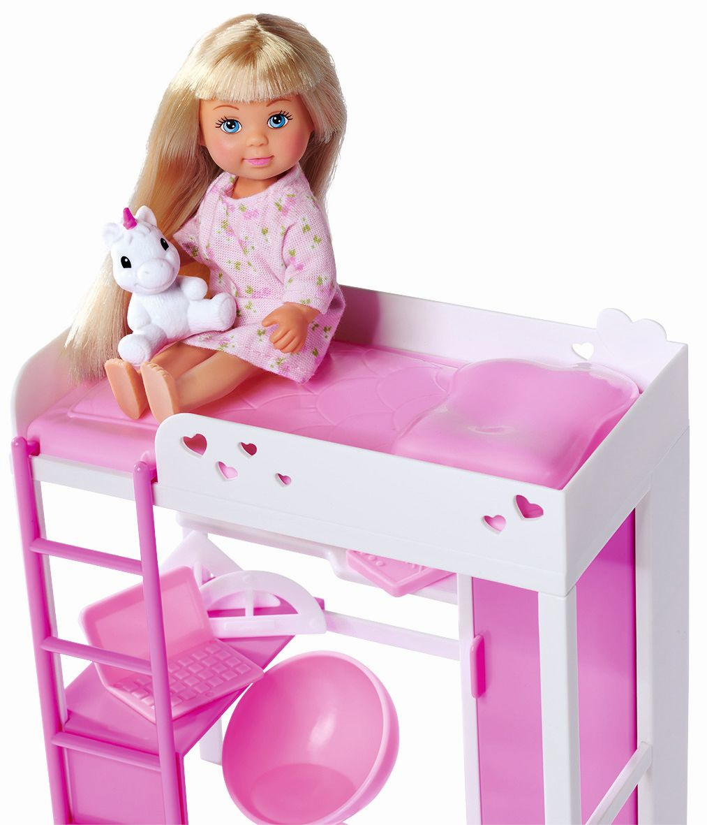 Panenka Evička s vysokou postelí, pracovním stolem, šatní skříní a dalším příslušenstvím. Výška panenky 12 cm.