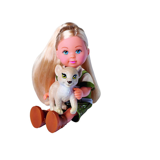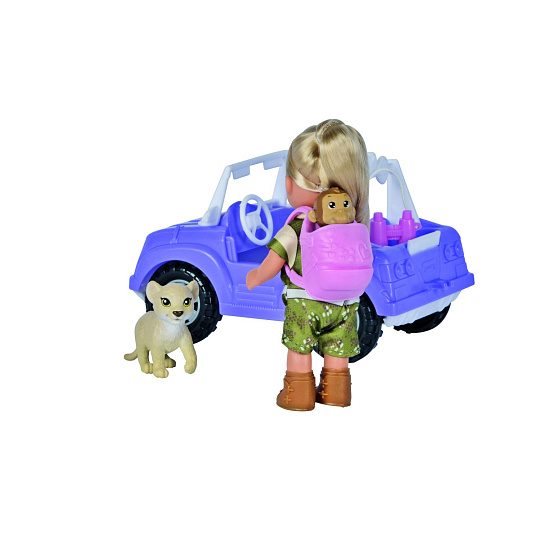 Panenka Evička v safari oblečení a s terénním autem. Nechybí batůžek, malá opička, lvíček a dalekohled. Délka auta 16 cm. Výška panenky 12 cm.