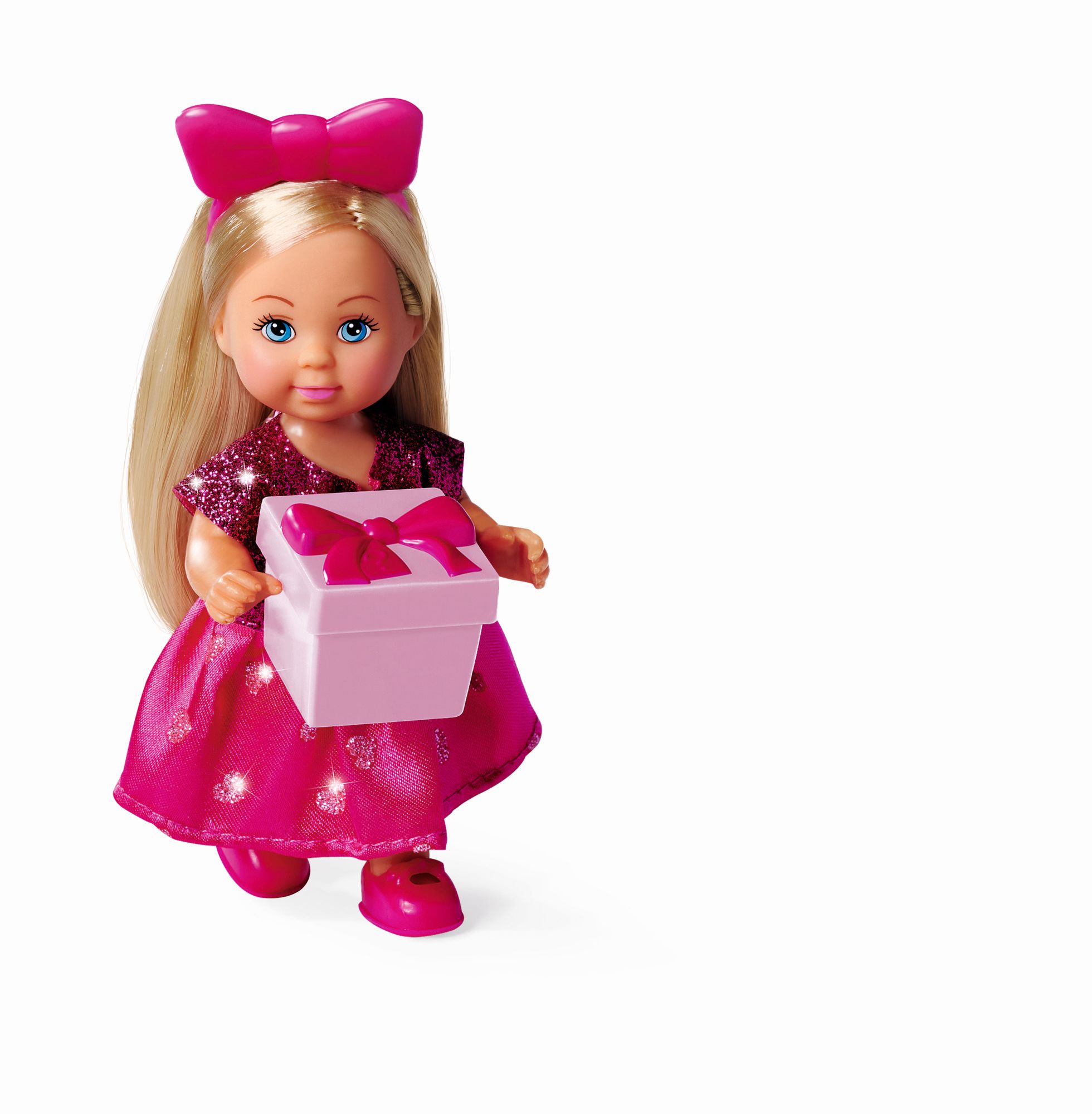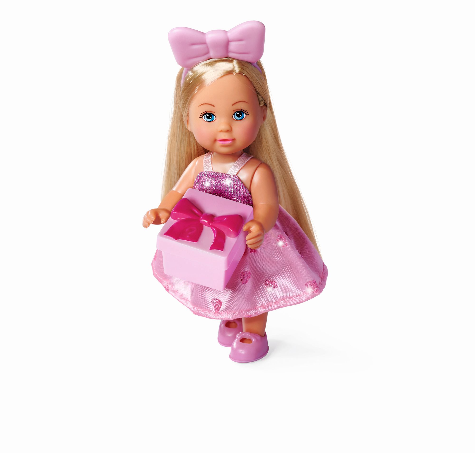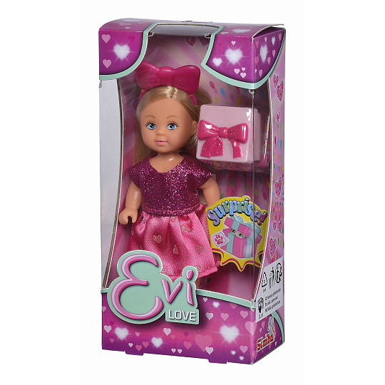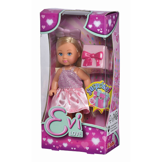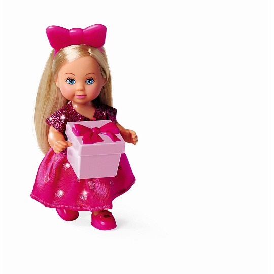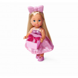 Panenka Evička v roztomilých třpytivých šatech s mašlí. Součástí je krabička s překvapením, ve které je štěňátko. Velikost panenky 12 cm.