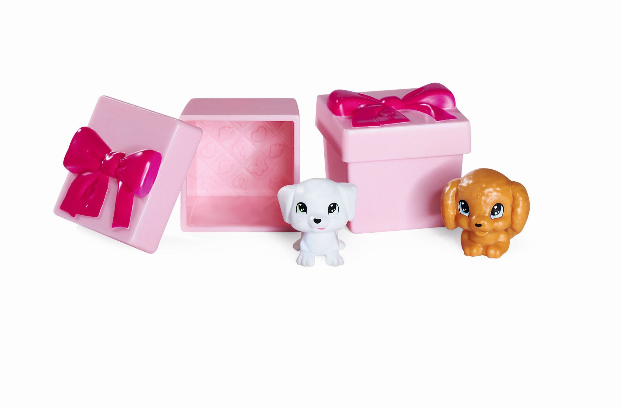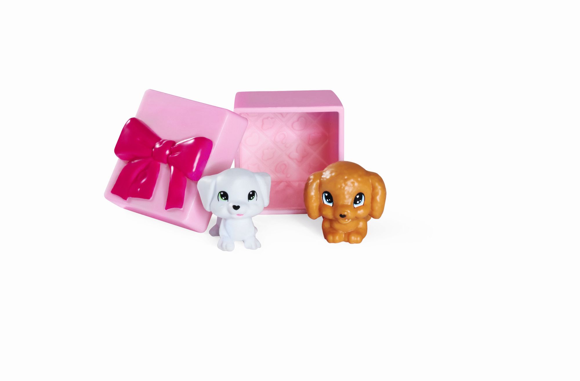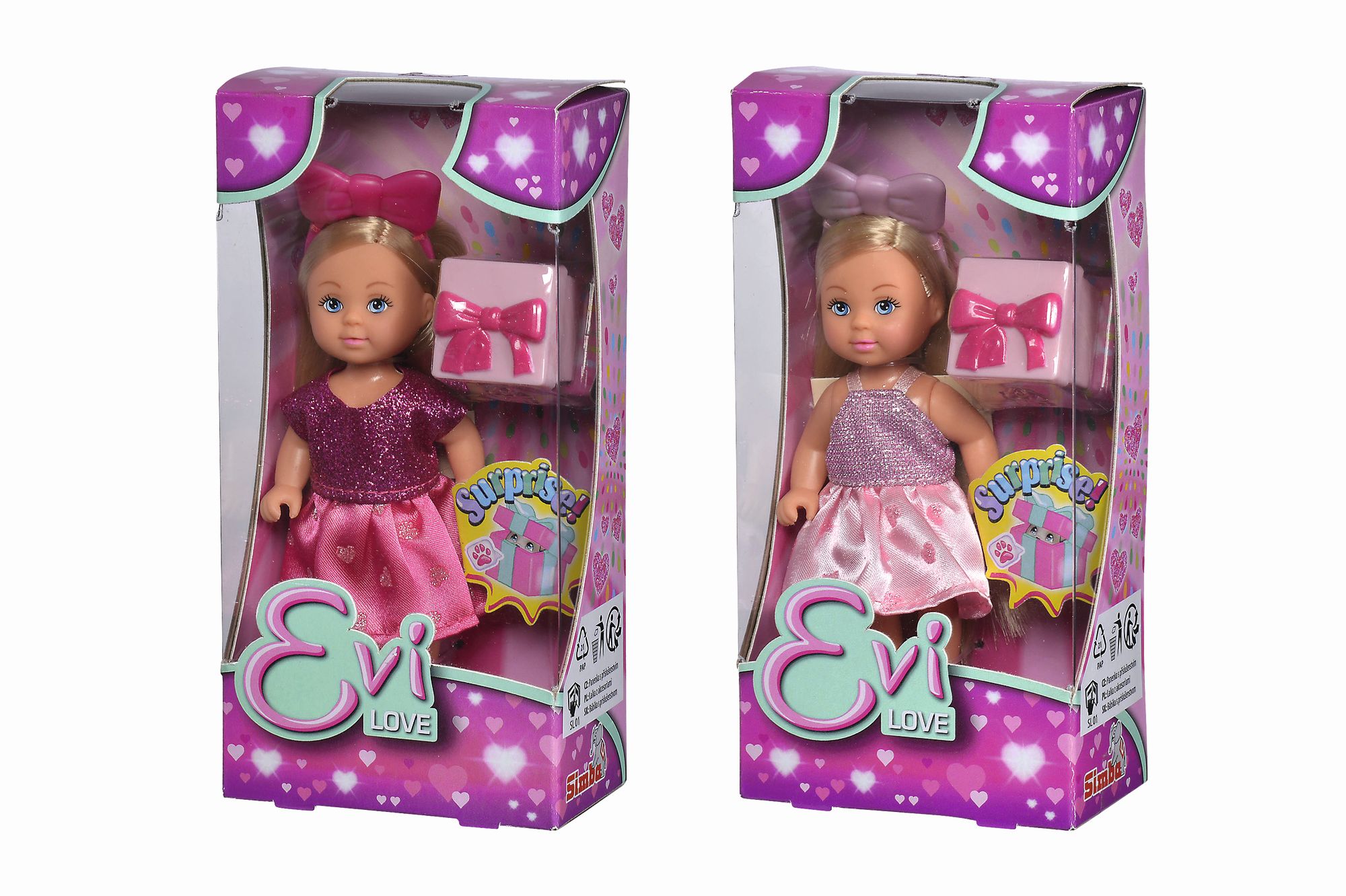 Panenka Evička v roztomilých třpytivých šatech s mašlí. Součástí je krabička s překvapením, ve které je štěňátko. Velikost panenky 12 cm.