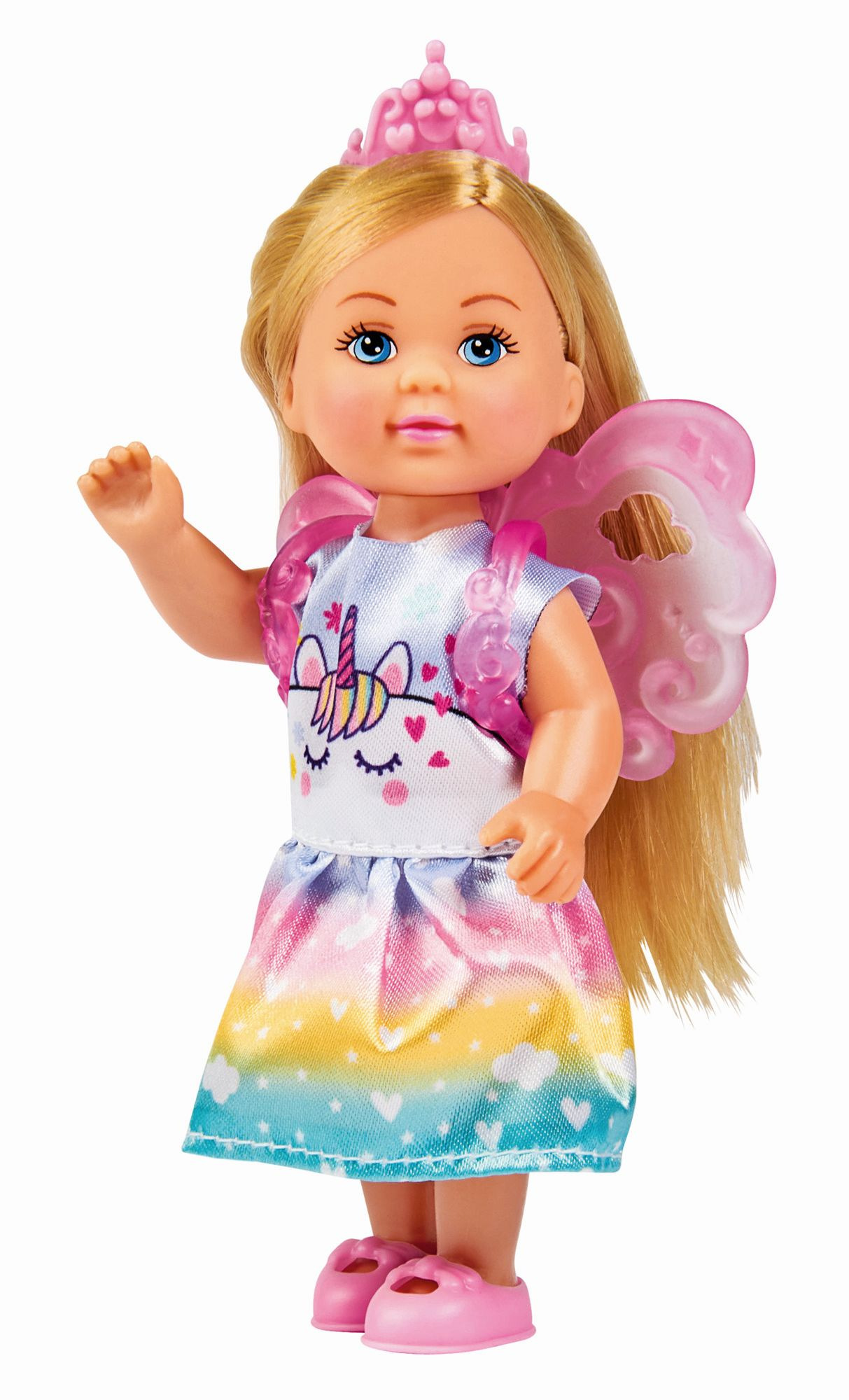 Panenka Evička jako duhová princezna s barevnými vlásky. Výška 12 cm. 3 druhy. Cena za 1 kus.