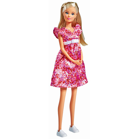 Panenka Steffi - těhotná, s miminkem v bříšku. Bříško panenky lze otevřít a vyndat malé miminko. Součástí 13 ks příslušenství pro miminko.