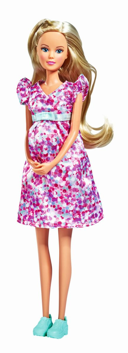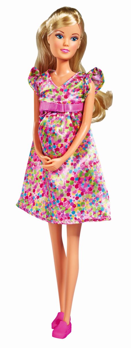 Panenka Steffi - těhotná, s miminkem v bříšku. Bříško panenky lze otevřít a vyndat malé miminko. Součástí 13 ks příslušenství pro miminko.