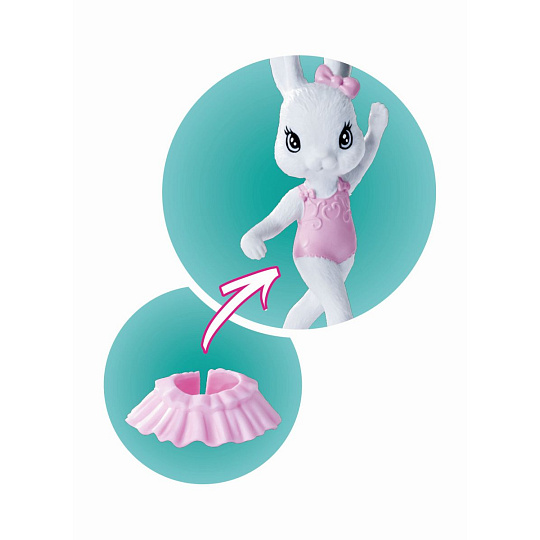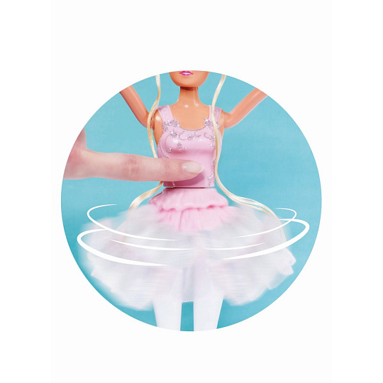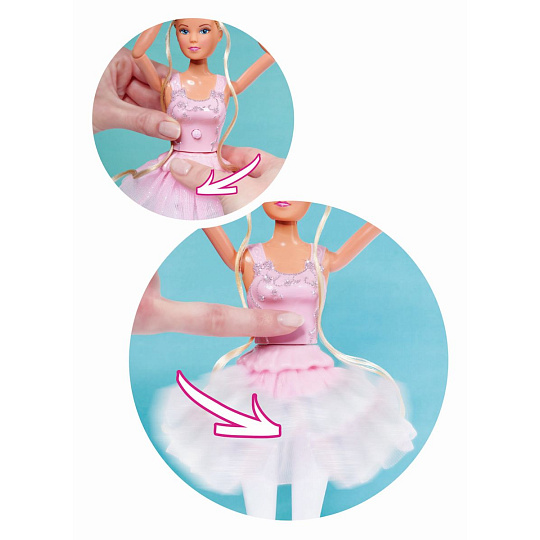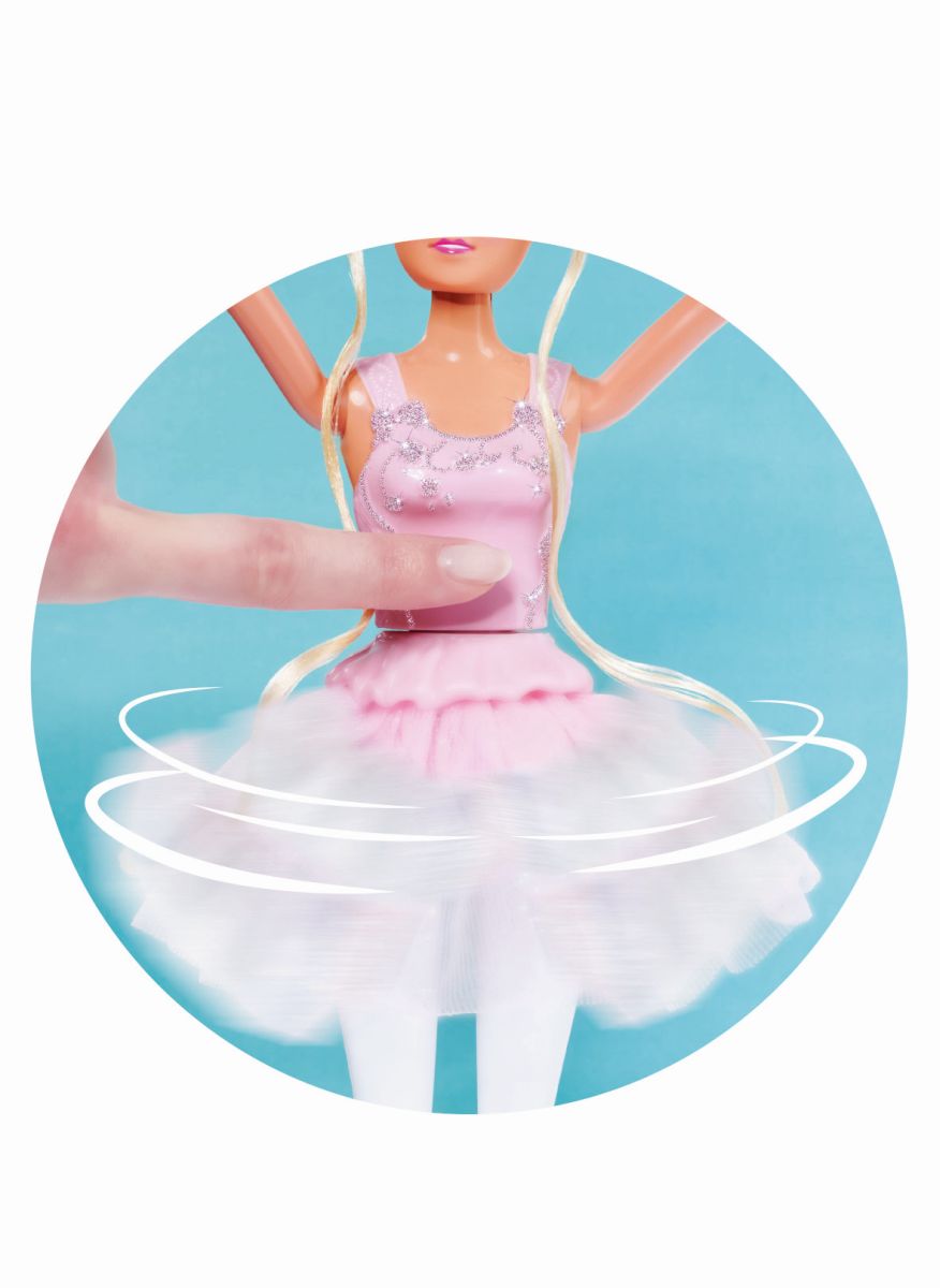 Panenka Steffi jako baletka s točící se sukní, s taneční kamarádkou králíčkem. Velikost panenky 29 cm.