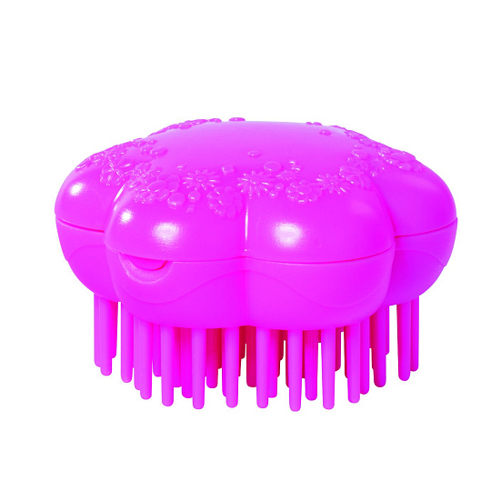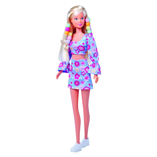Panenka Steffi v kytičkovém dvoudílném outfitu, s háčkem na navlékání korálku na pramen vlasů, barevnými korálky, gumou na fixaci a hřebenem s úložným prostorem. Výška panenky 29 cm.