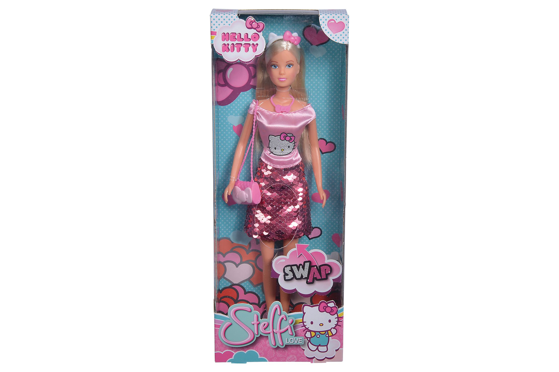 Panenka Steffi Hello Kitty, s flitrovou sukní se swap efektem. V příslušenství náhrdelník, čelenka a malá kabelka. Velikost panenky 29 cm.