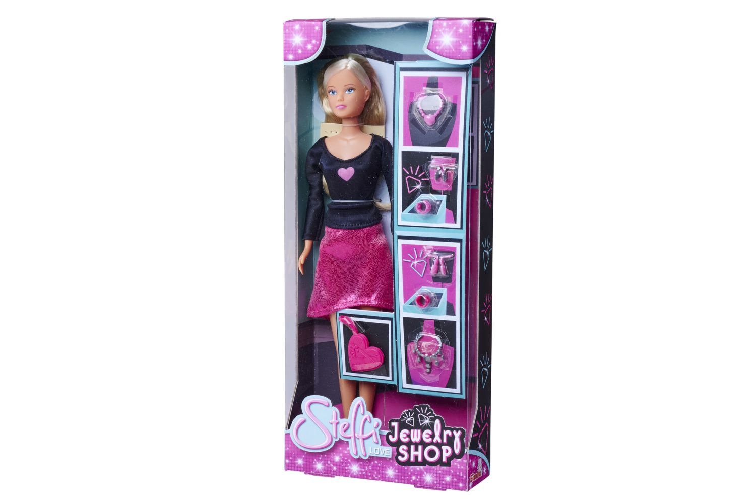 Panenka Steffi v sukni a obchod se šperky. Součástí je 2x náhrdelník, náušnice, náramek, kabelka. Velikost panenky 29 cm.