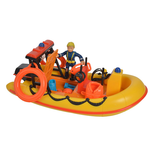 Záchranný člun Neptun z oblíbeného seriálu Požárník Sam. S tajnou přihrádkou a mechanickým navijákem. Figurka Penny v potápěčském oblečení a další příslušenství součástí. Délka člunu 20 cm. Člun jezdí s pomocí koleček.