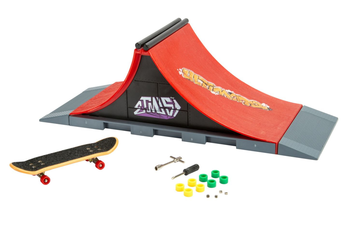 Prstový skateboard a rampa Ultimate s rozměry 27 x 10 x 9 cm. Součástí balení je 8 náhradních kol, nářadí, 2x šroub a matice.