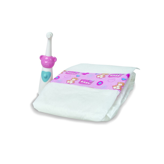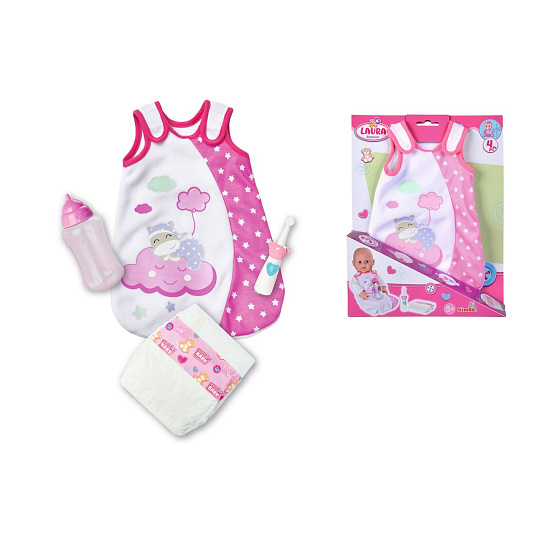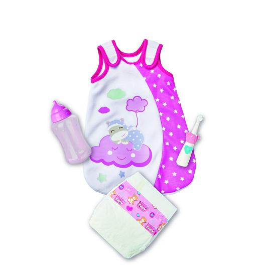 Sada na spaní obsahuje spací pytel, zubní kartáček, plenku a lahvičku pro panenky o velikosti 30-38 cm.