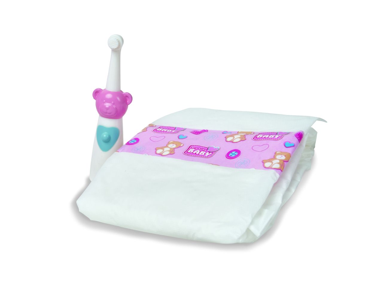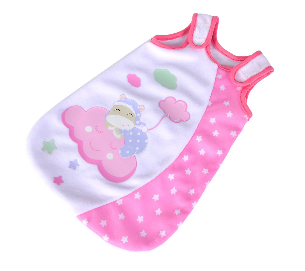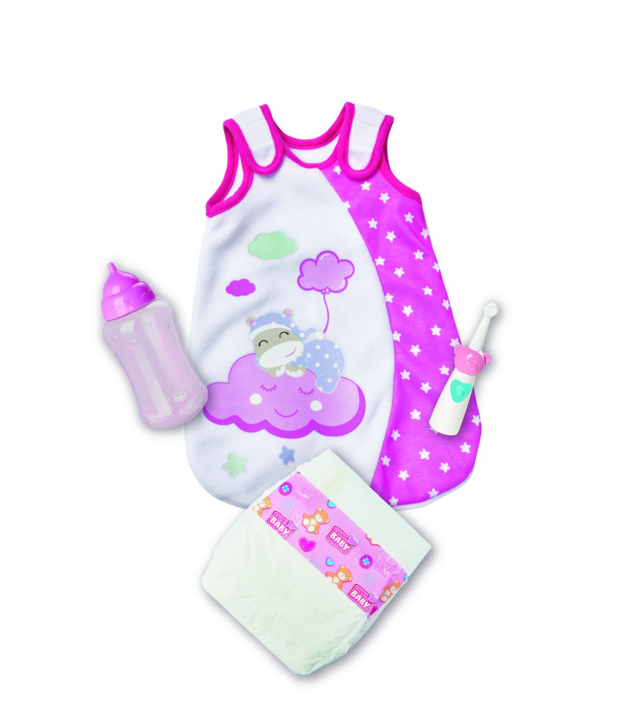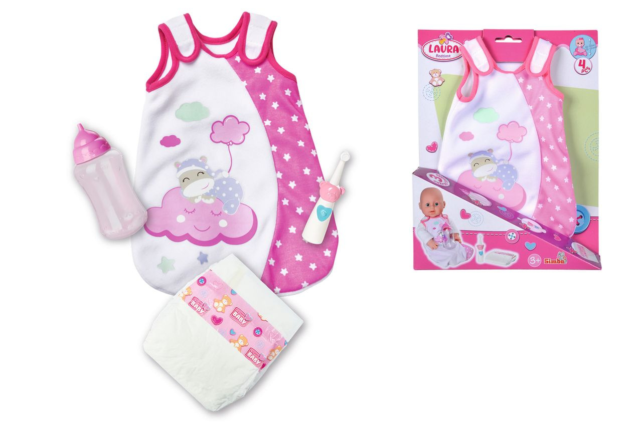 Sada na spaní obsahuje spací pytel, zubní kartáček, plenku a lahvičku pro panenky o velikosti 30-38 cm.