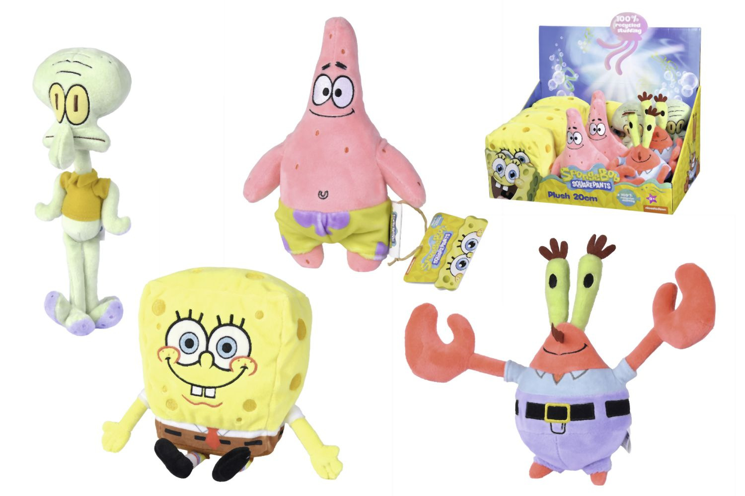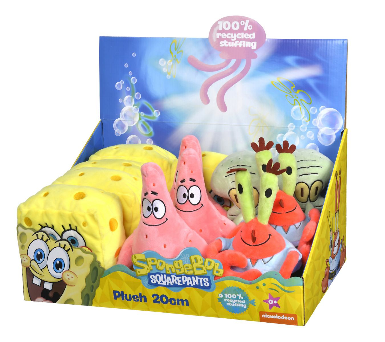 Plyšové postavy ze seriálu Spongebob v kalhotách 4 druhy - SpongeBob/Patrick/Sépiák/pan Krabs. S recyklovanou výplní v licenci Spongebob. Velikost 20 cm. Baleno v displeji po 12 kusech (5x Spongebob, 3x Patrick, 2x Sépiák a 2x pan Krabs).
