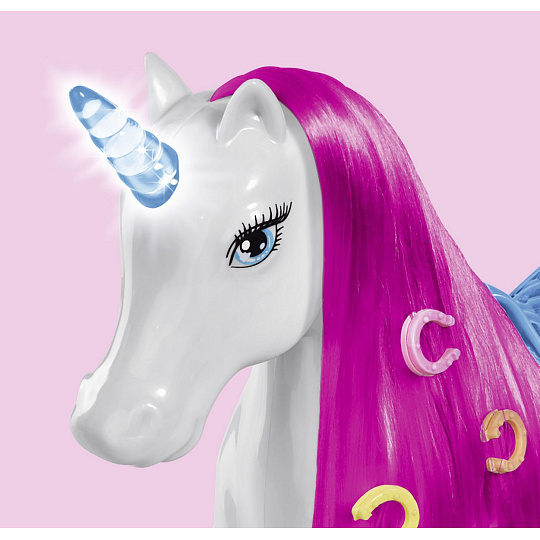 Jednorožec se svítícím rohem a sedlem, součástí ozdoby a hřeben na hřívu, pro panenky o velikosti 29 cm. Panenka není součástí.