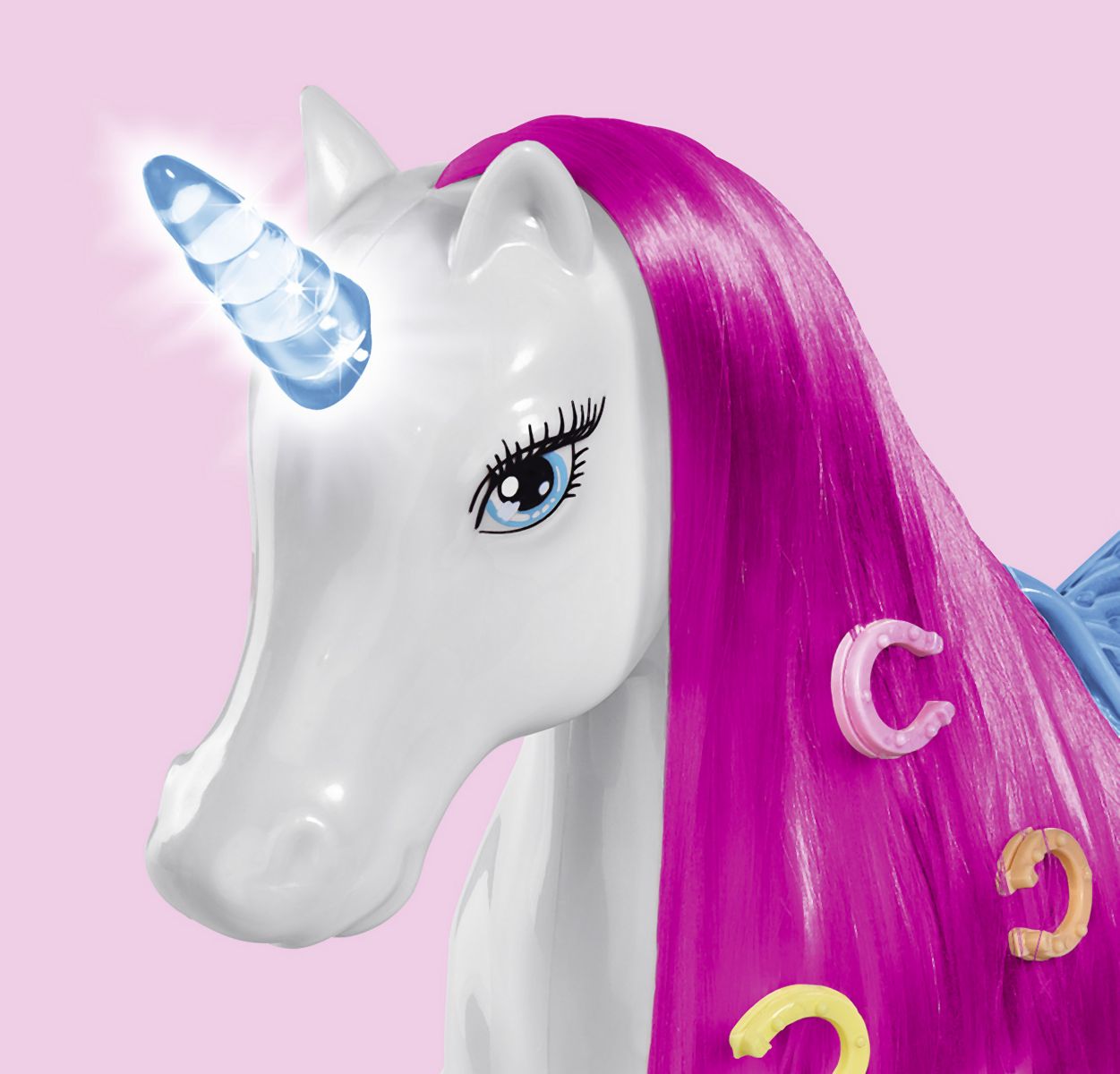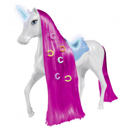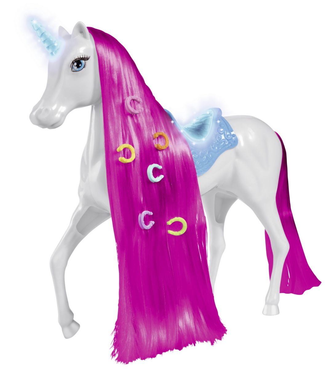 Jednorožec se svítícím rohem a sedlem, součástí ozdoby a hřeben na hřívu, pro panenky o velikosti 29 cm. Panenka není součástí.