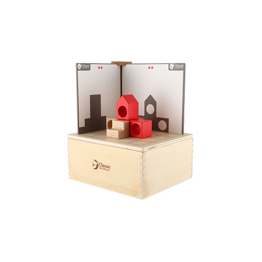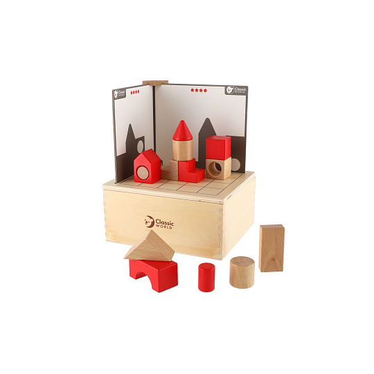 Tato sada bloků procvičí prostorovou orientaci dětí a schopnost logického myšlení. Sada využívá inspiraci ze světelné projekce. Děti pomocí svého prostorového myšlení sestaví blok podle kartičky a musí sladi obě strany. Karty jsou od jednoduchých až po obtížné úrovně. Balení obsahuje 41 dřevěných dílků a 14 karet. Rozměr dřevěné krabičky: 18,5 x 16 x 9 cm Vhodné pro děti od 3 let